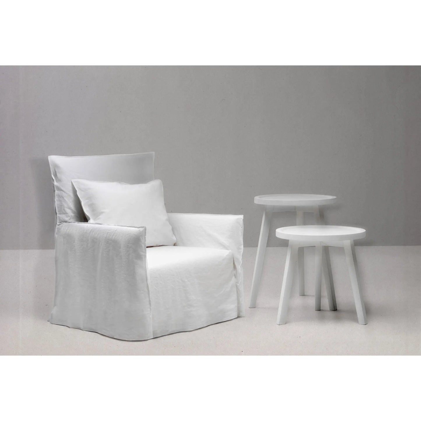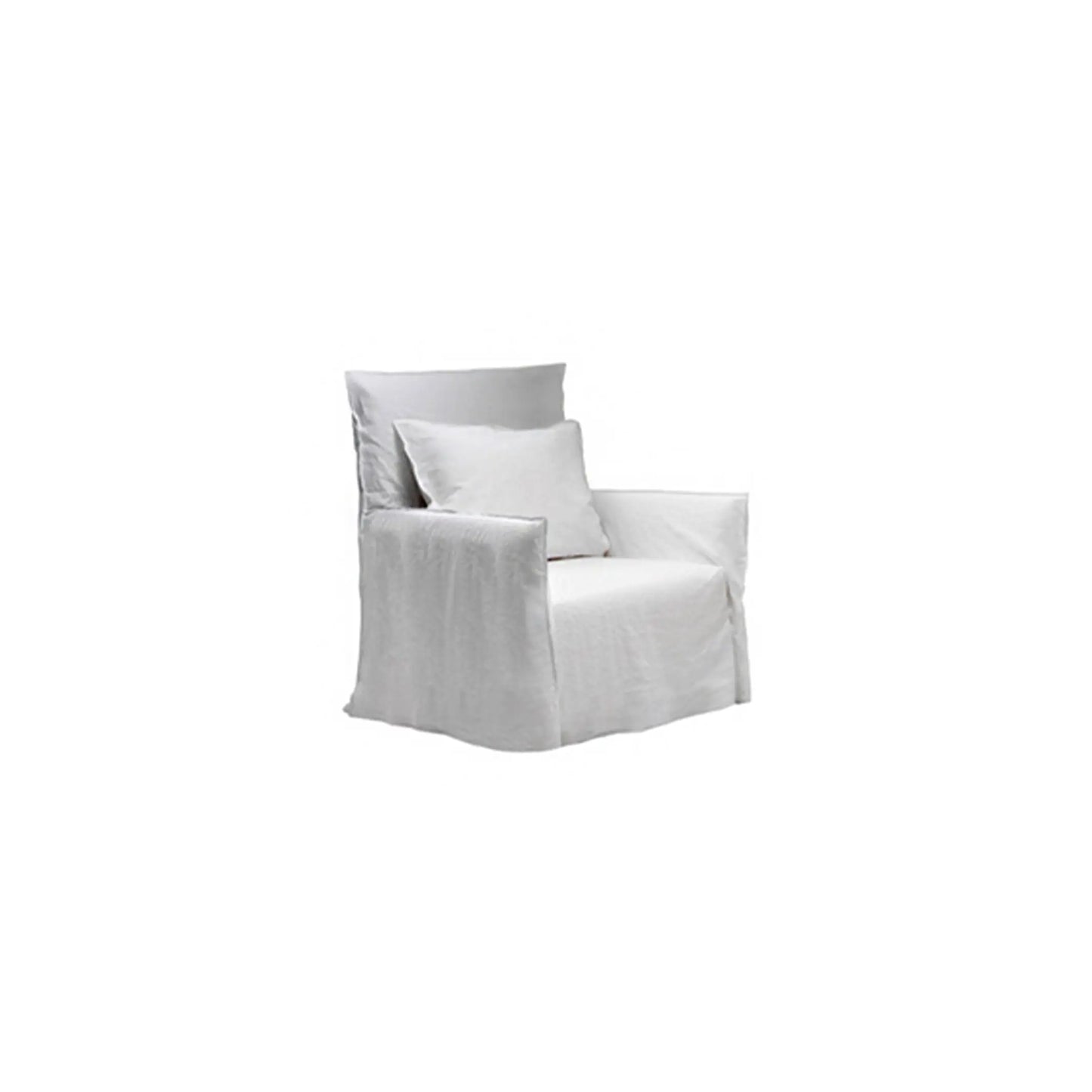 Gervasoni Ghost is a sofa created with a light body and essential volumes. Made from a thin, minimal structure padded with polyurethane foam, Ghost contains soft loose cushions in mixed down. The main feature of the Ghost sofas is the removable cover, an oversize house whose shape is underlined by the visible stitching, allowing it to be put on and taken off in a flash. A textile product that easily changes appearance, allowing you to go from a formal to an informal look with ease and speed.