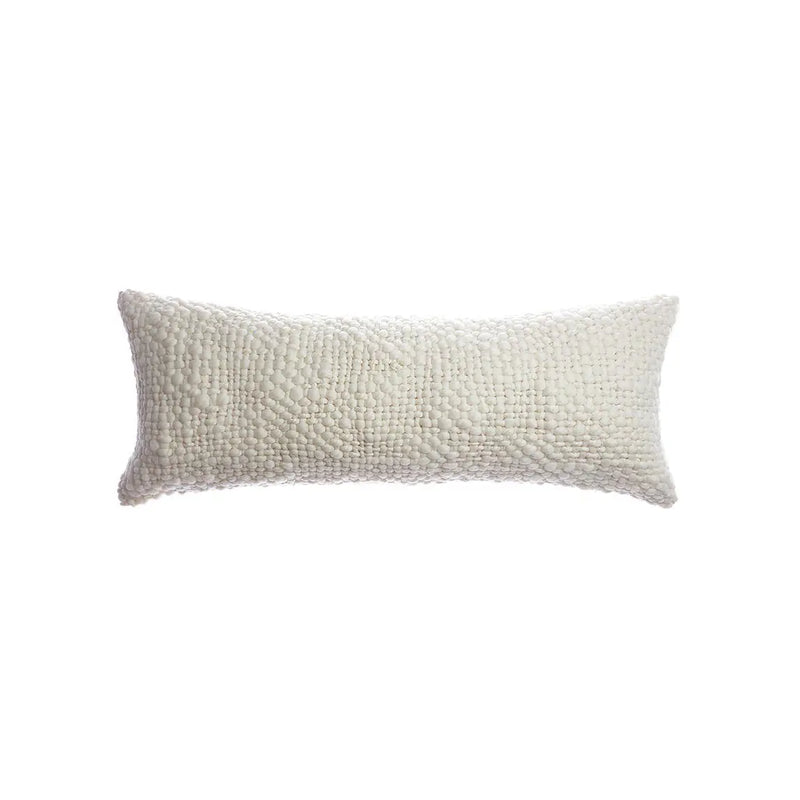 Super soft natural merino wool creates a gorgeous, one-of-a-kind look on this cable knit throw bed lumbar pillow. Volumes of chunky superfine merino wool yarn have been loosely hand knitted together into tighten chunky knots that resemble small fluffy clouds. Backed with white natural linen and finished with a hidden zipper closure.