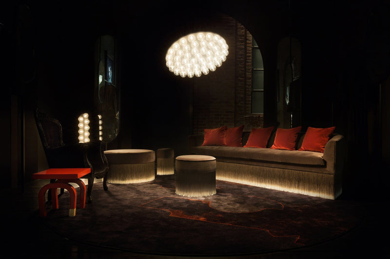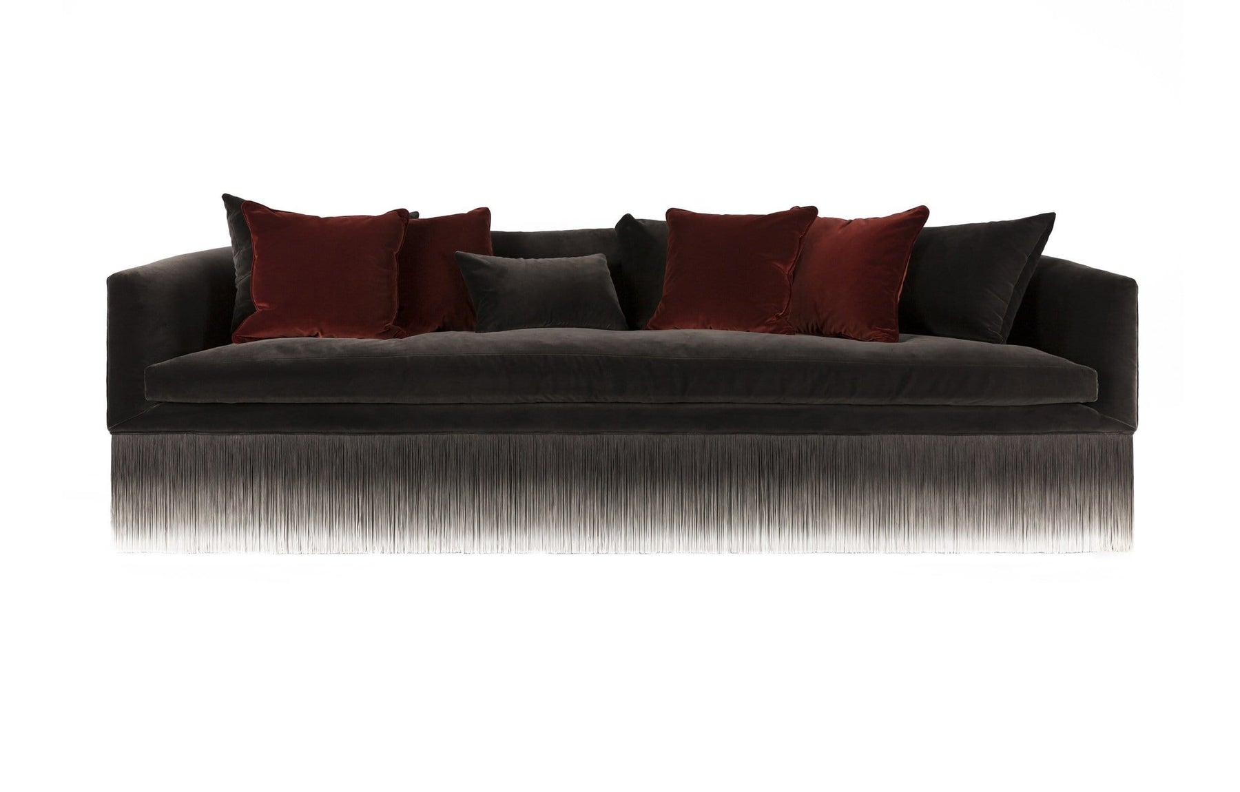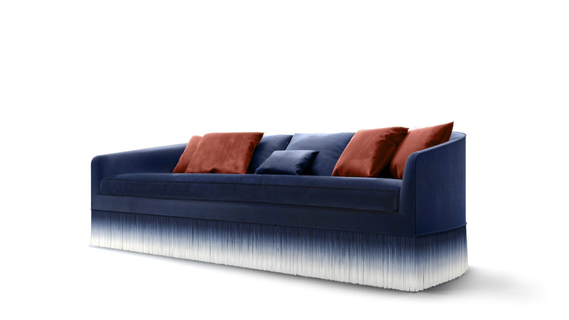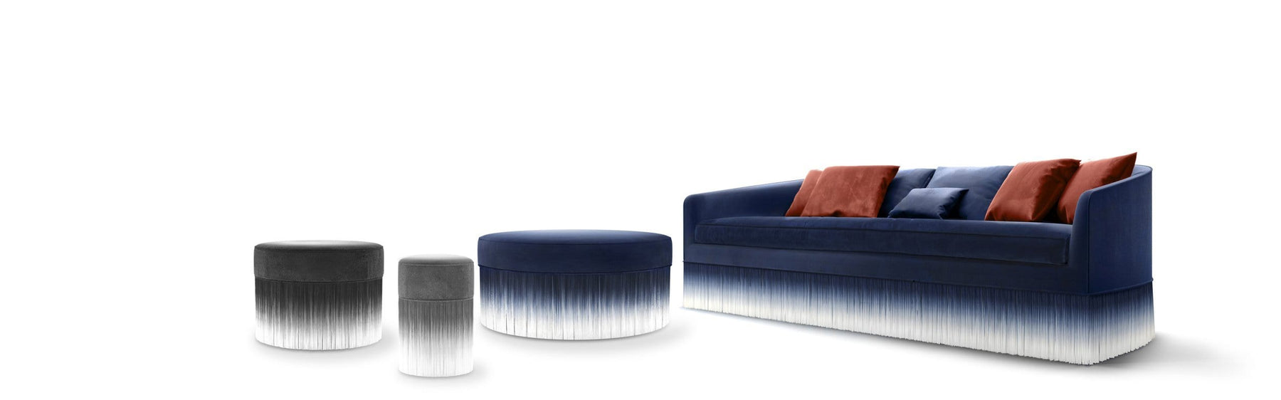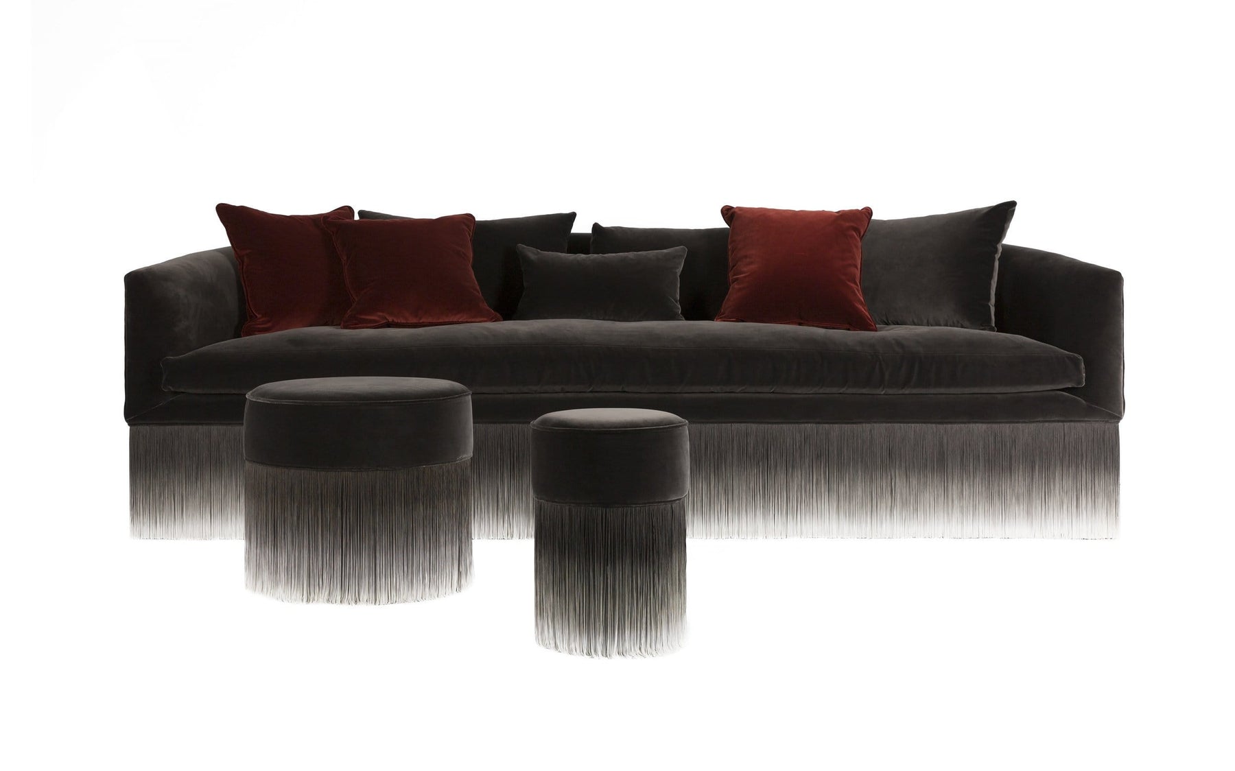 An elegant and comfortable sofa dressed in heart-warming velvet, softly floating on long sensuous fringes that decorate and enhance it, producing a fresh breeze of lightness all around the room: this is Amami Sofa by Lorenza Bozzoli. The sofa’s generous size makes is a cozy companion during moments of relaxation and social gatherings, for it pleases and pampers you and your guests at the most, being both extremely cozy and a joy to the eye. The addition of a sublime pouf available in three dimensions and matching cushions to accessorize it make it simply irresistible!