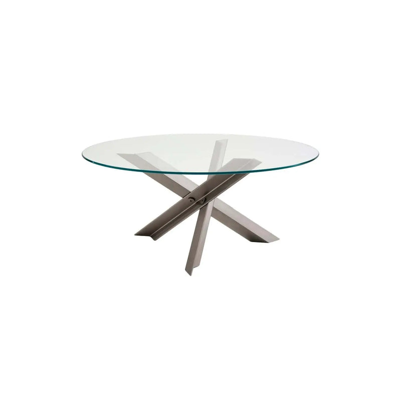 The new Bolt Table is designed by Mario Bellini for B&B Italia. After various experiences of developing wooden supports for tables, the architect proposed an unusual metal frame, extremely simple, but of strong materiality. Three steel interfacing crosspieces in angular sections create a base supporting a round top in transparent extra-light glass. The table is available in a single size (diameter cm 165) and three base-frame finishes: bronze oxidized steel, sand blasted stainless steel, and bright stainless steel.