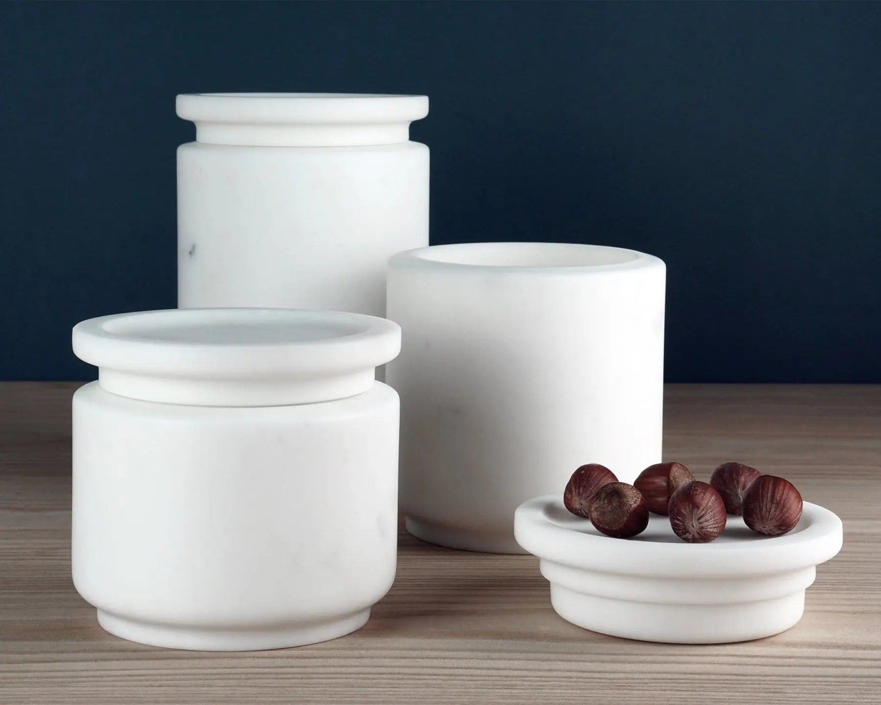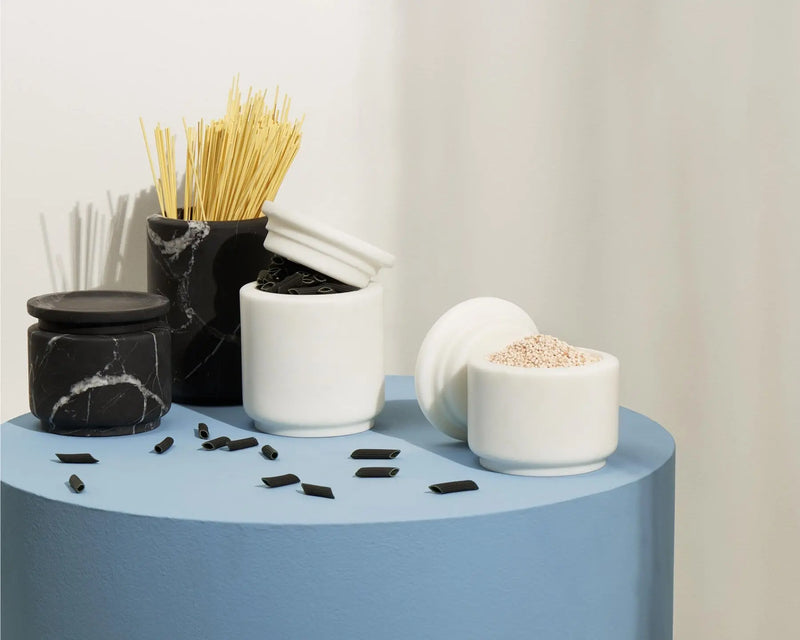 The poise of marble links with the object, the detail at the table, the container as decoration, which creates a unique atmosphere, having been crafted from matter and creative thought. Ivan Colominas is back to seize marble and, in doing so, chooses the white michelangelo and black marquinia characterizing the first collection Materia e Tavola. The marble embellishes objects that belong to everyday life and express personality; distinct but soft designs; lids that don’t seal unequivocally, but rest slightly against the silhouettes. A refined collection articulated through cylinders that vary only in size and doesn’t ignore that the best ally in the thorough organization of a space is the container, which thanks to minute details, becomes increasingly ours.