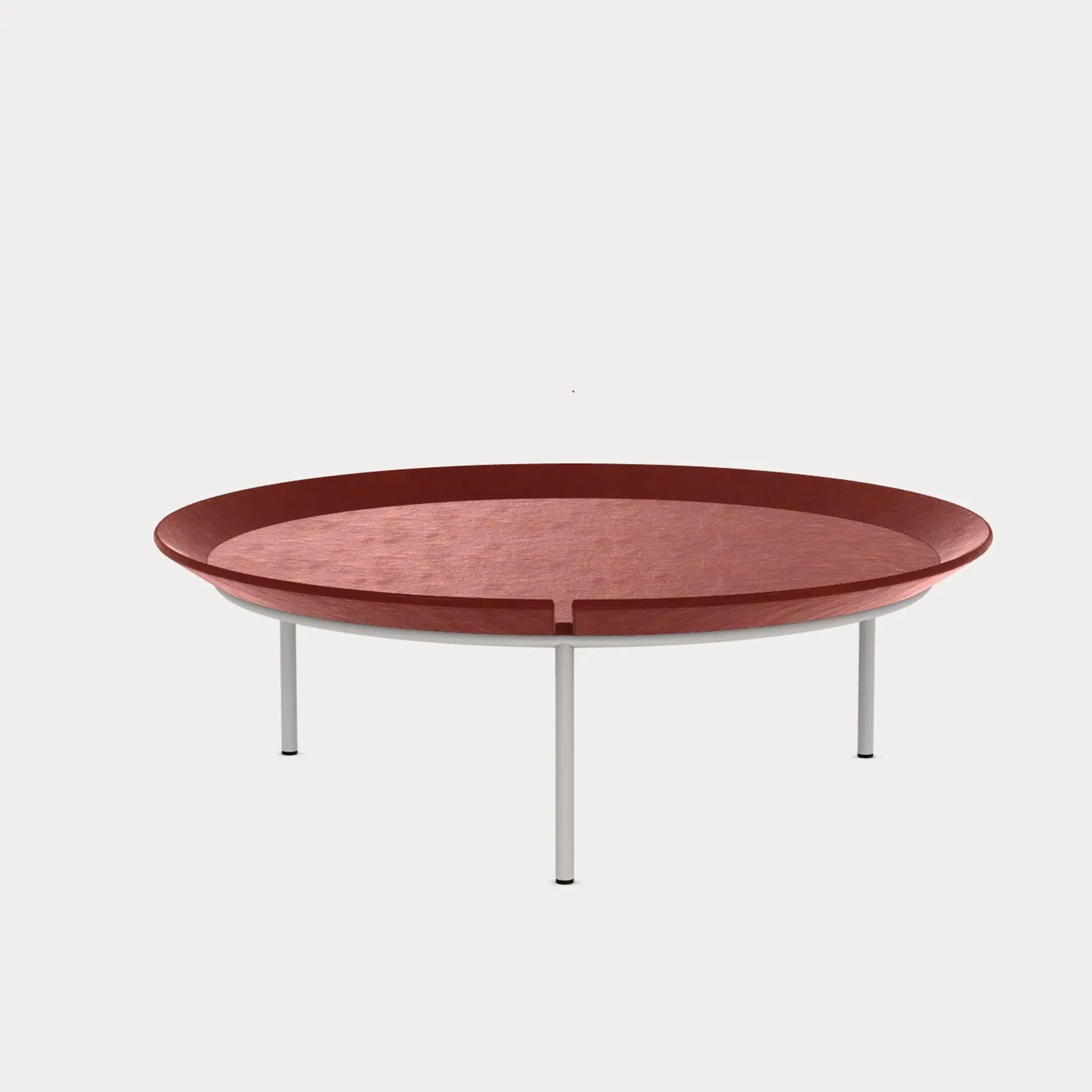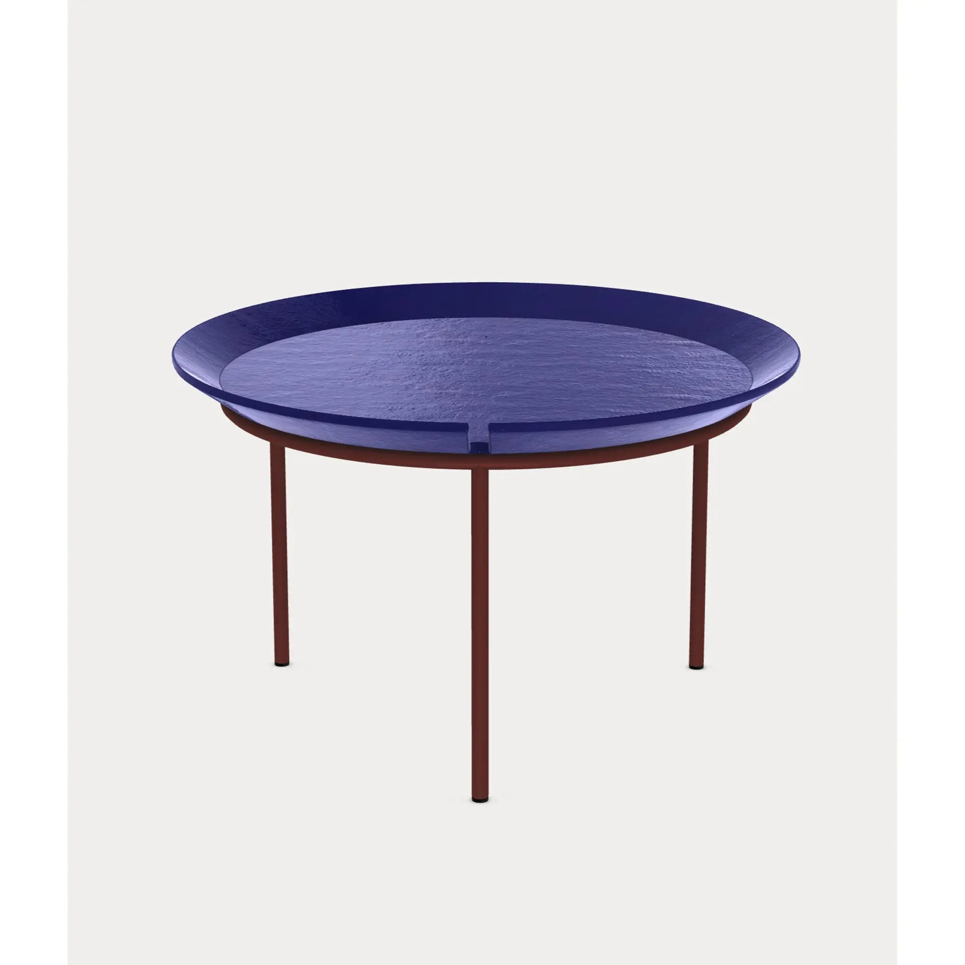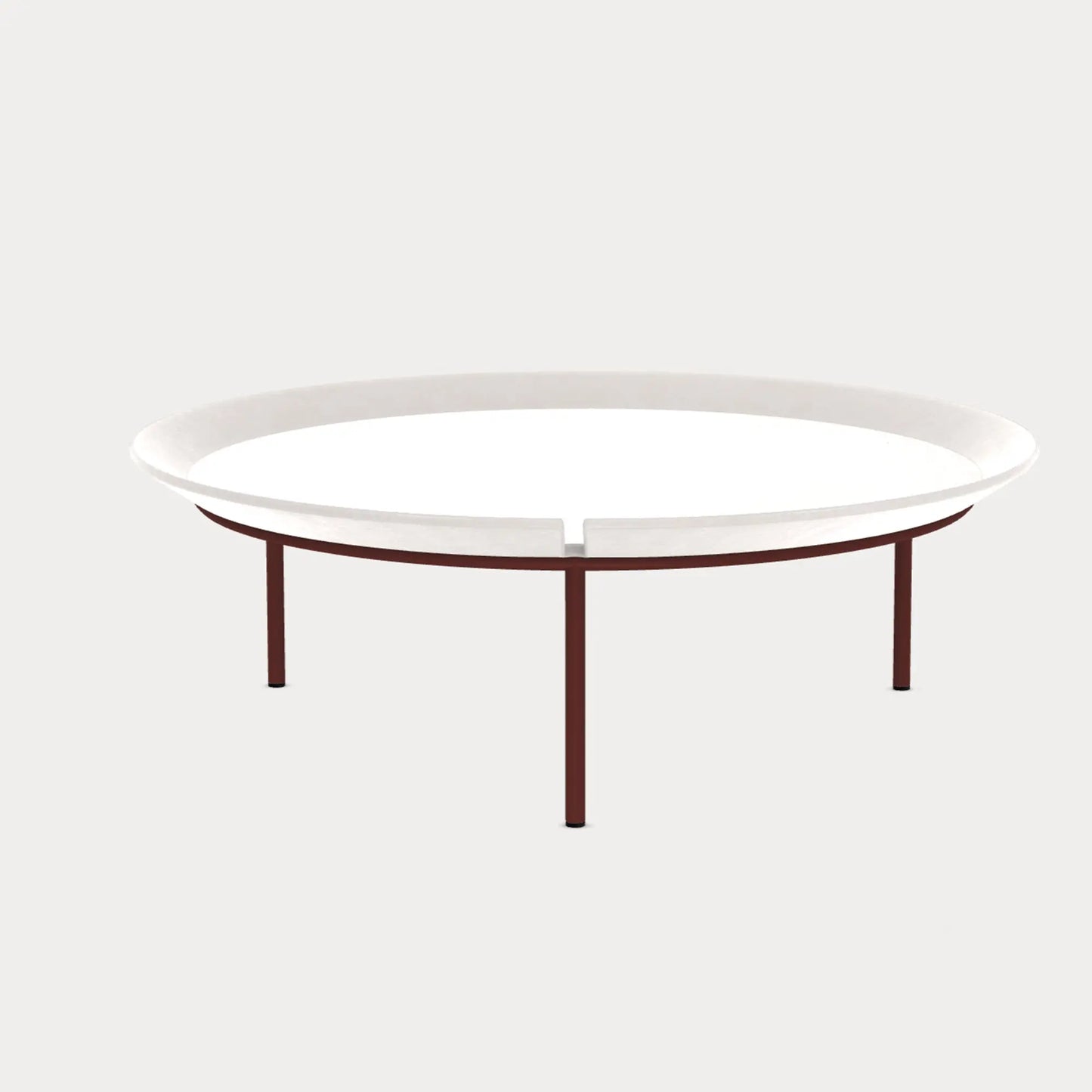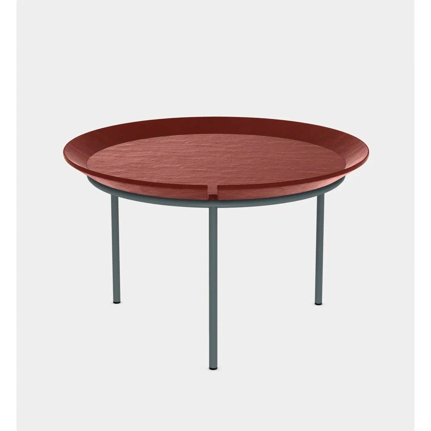 Table with lacquered stainless steel tubular base in matte pearl, oxido or slate. Table top in white, red or blue Millgres.