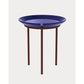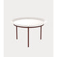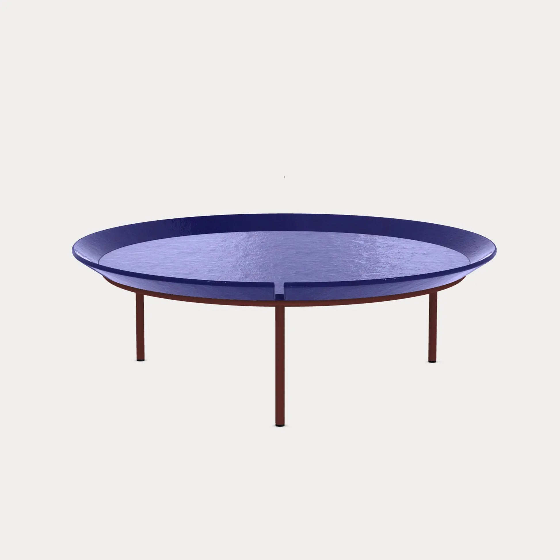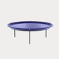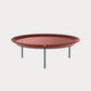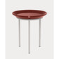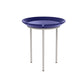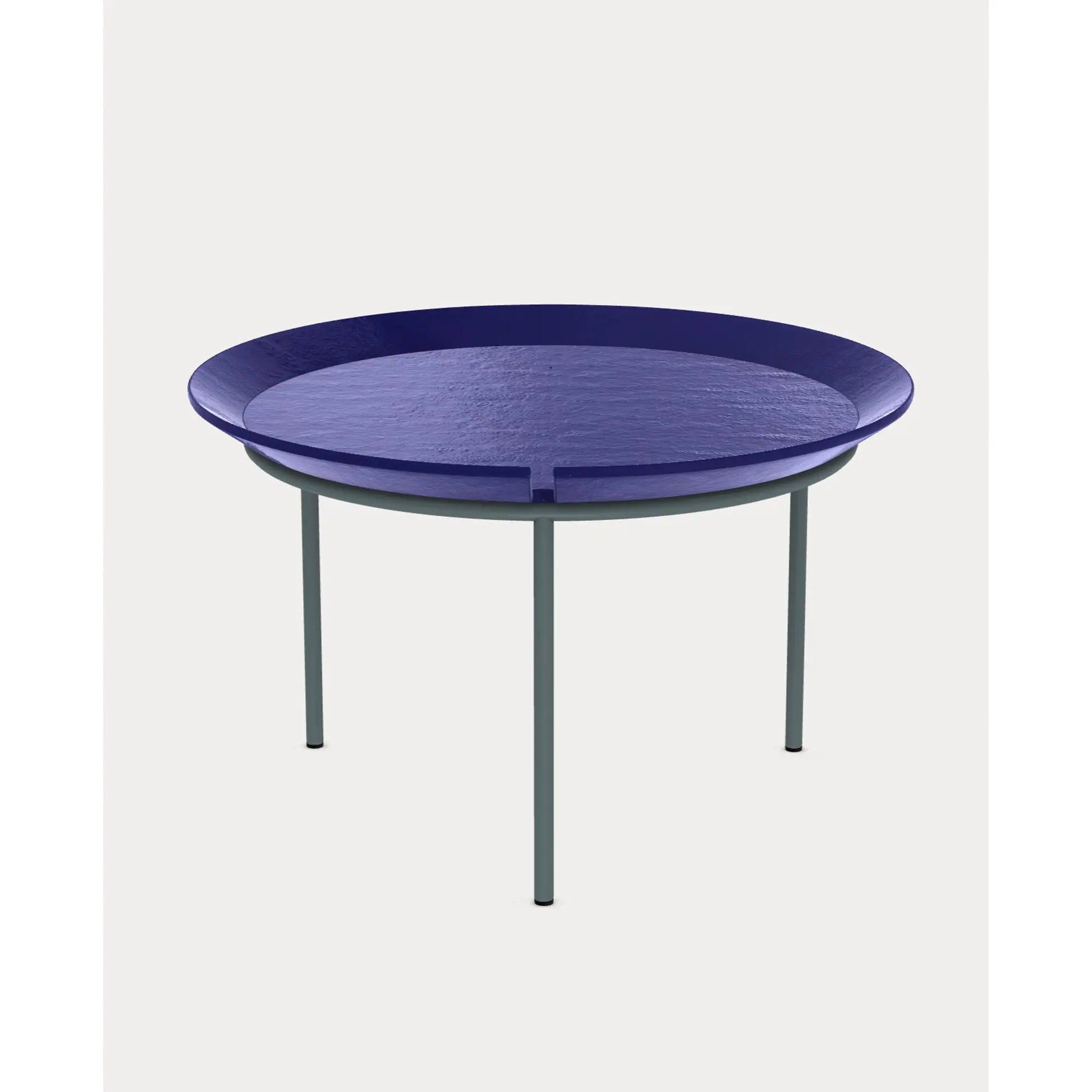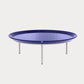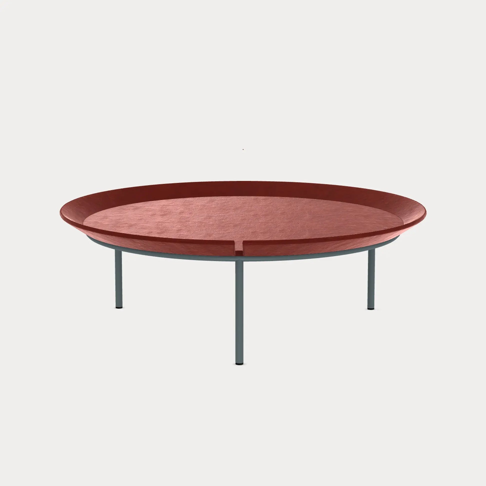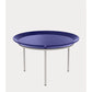 Table with lacquered stainless steel tubular base in matte pearl, oxido or slate. Table top in white, red or blue Millgres.