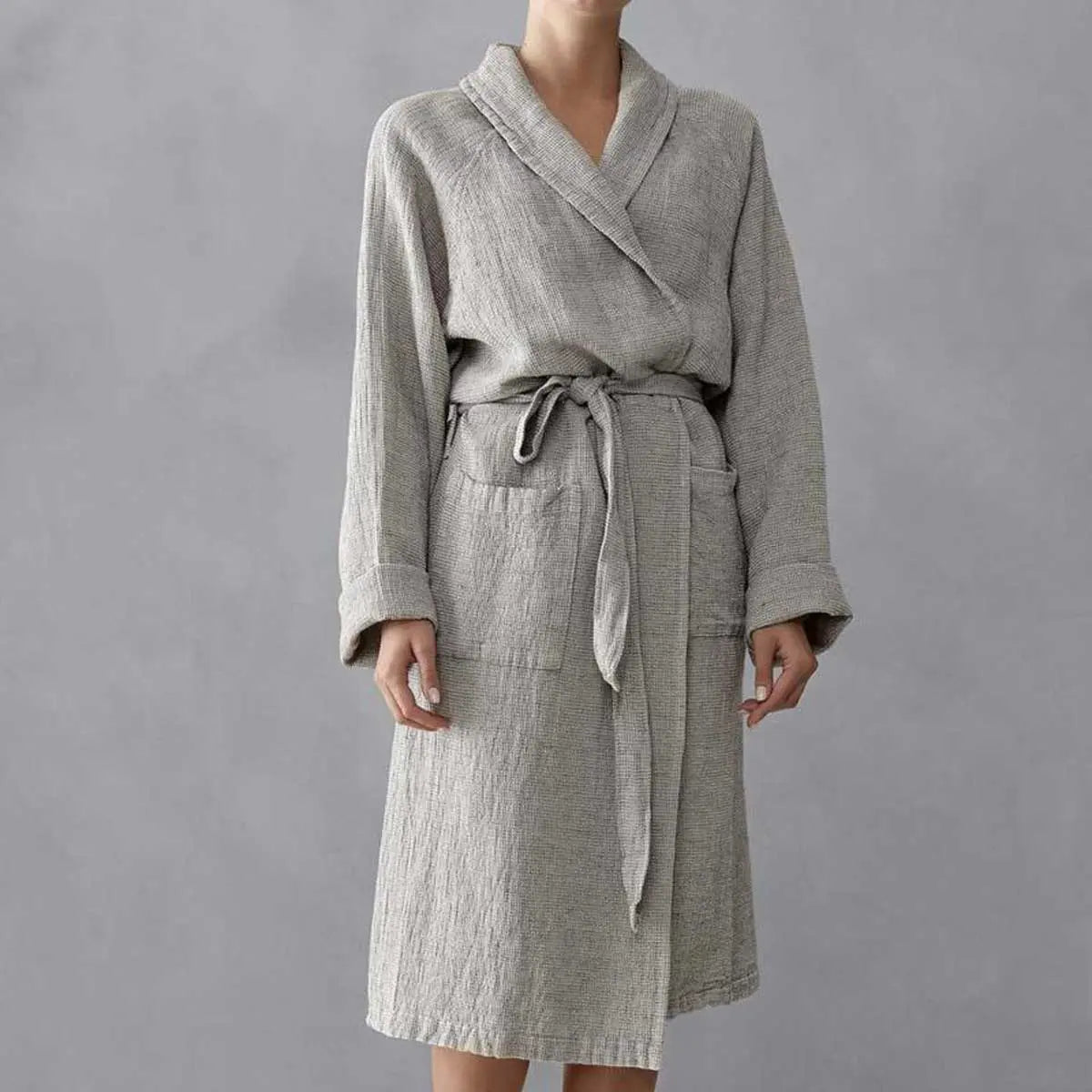MACO bathrobe is produced from a refined mix of linen and cotton with honeycomb processing. This fresh and light fabric, the product of crossing colored and white yarns, creates an elegant mélange effect.