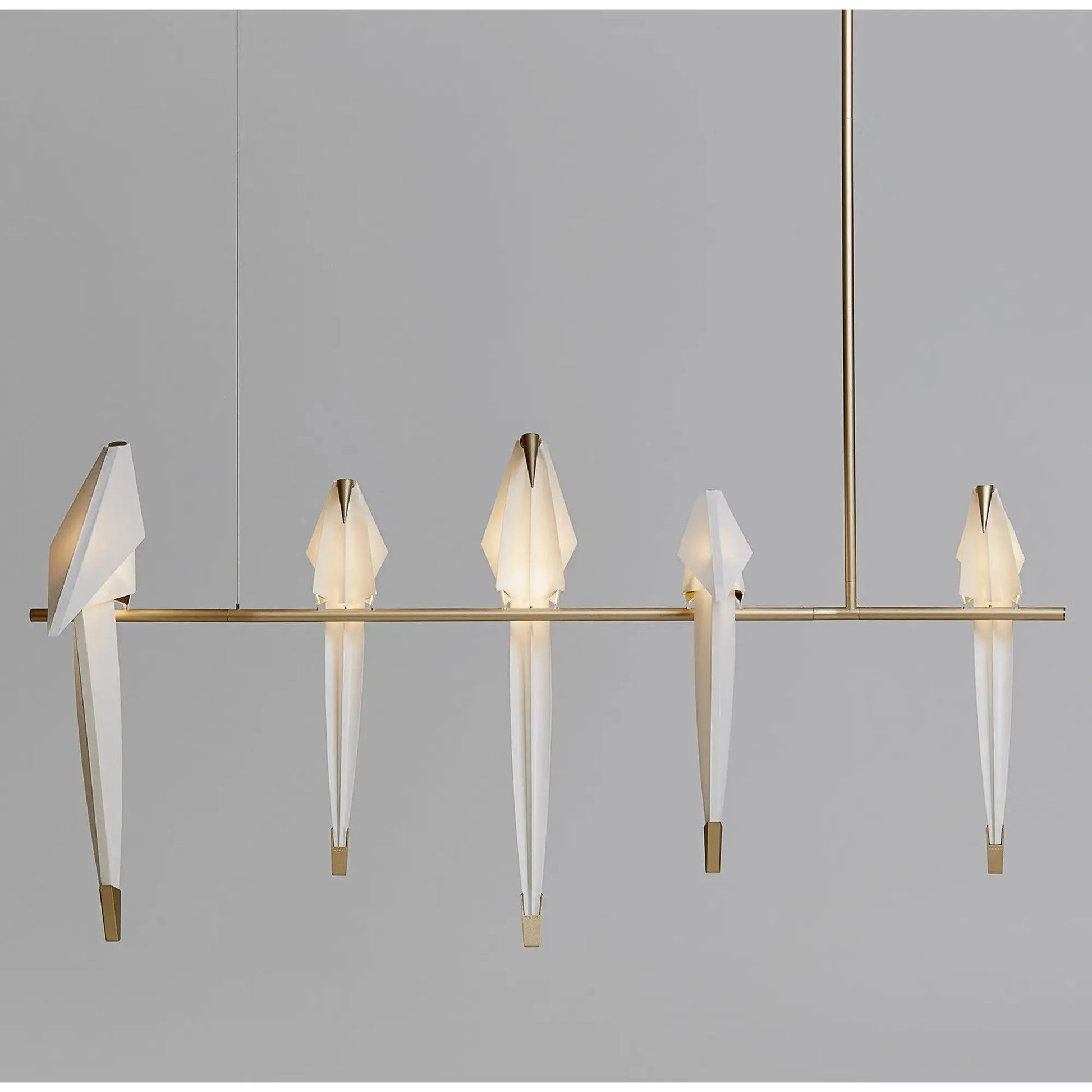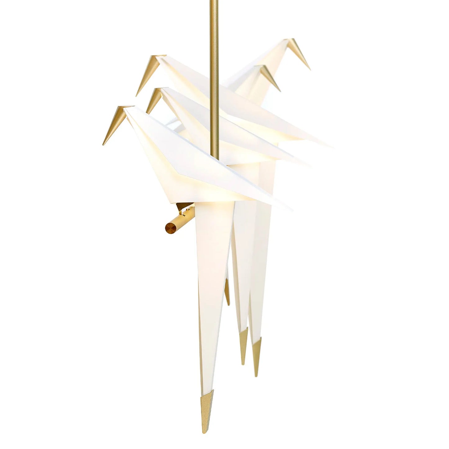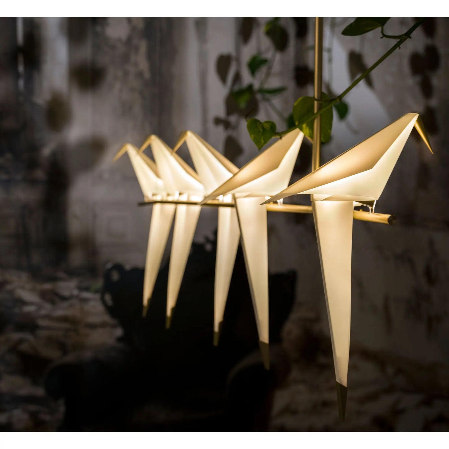Solid State LED. Includes 3 small and 2 large birds. Minimum of 11.8in | 30cm from the ceiling. One straight connector included. Suspension poles included with set 1: 2x19.7in | 50cm, 2x5.9in | 15cm, 2x3.9in | 10cm (59.1in | 150cm total) finished in matching color.