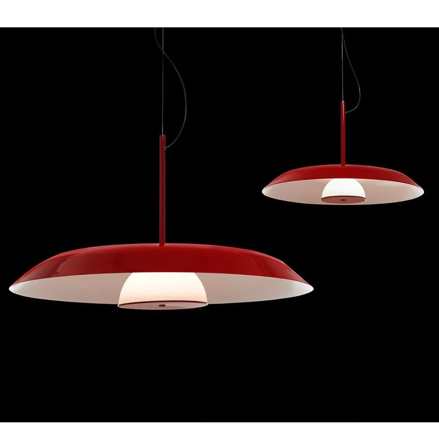 With its soft light and low-profile silhouette, Iride is a lamp that renews the archetypal form of dome lighting using a contemporary language. Two suspended lamps with different sizes for a chosen and sought-after lighting effect that gives the lamp harmony, ensuring uniform diffusion and visual comfort within rooms. The central opaline glass diffuser becomes an element with personality, drawing the stylised shape of a drop in the centre of the minimalist dome on which it rests. The light diffuses due to the lampshade reflection and comes out softened. An interior lamp designed for homes, Iride is available in a total white version or in two colours: reflective white inside, black or glossy red outside.