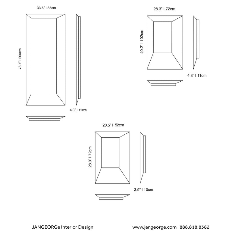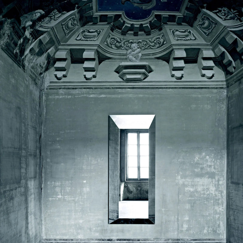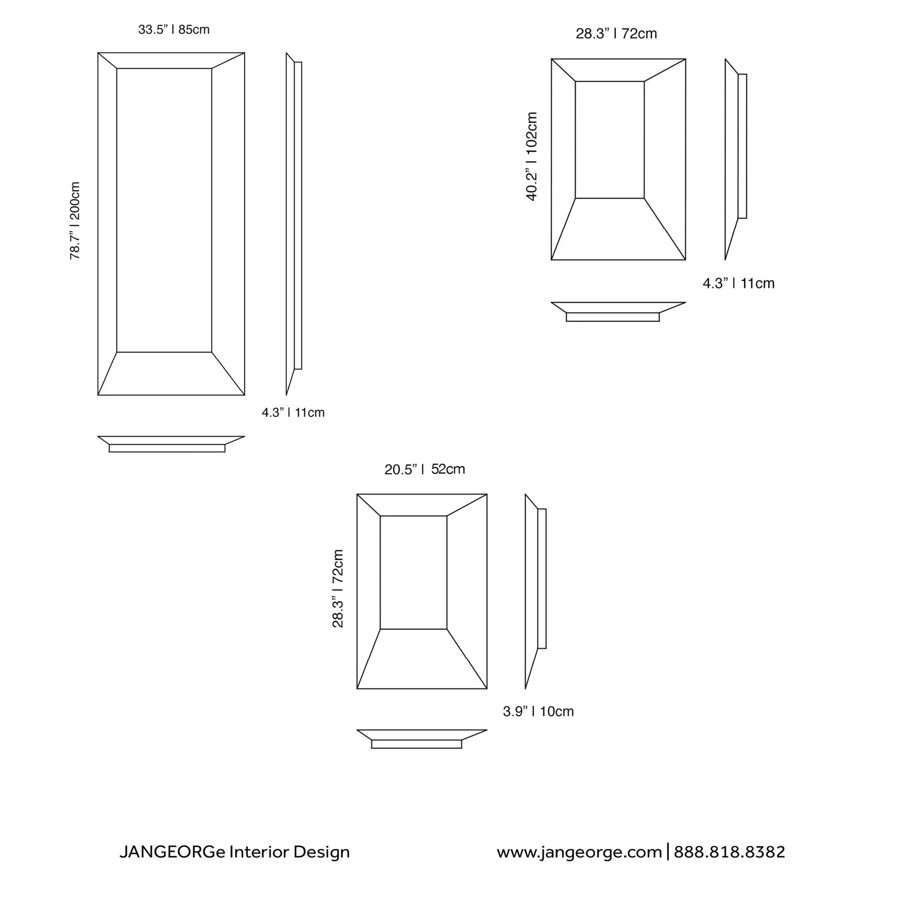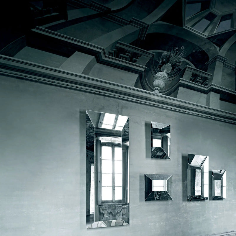 Mirror shaped in an artificial perspective, creating a “sfondato” effect, available in three different sizes. The converging frame is in mirrored glass and each side has different widths and inclinations, generating in this way fragmented and unexpected reflections. Each mirror can be hung in any direction.