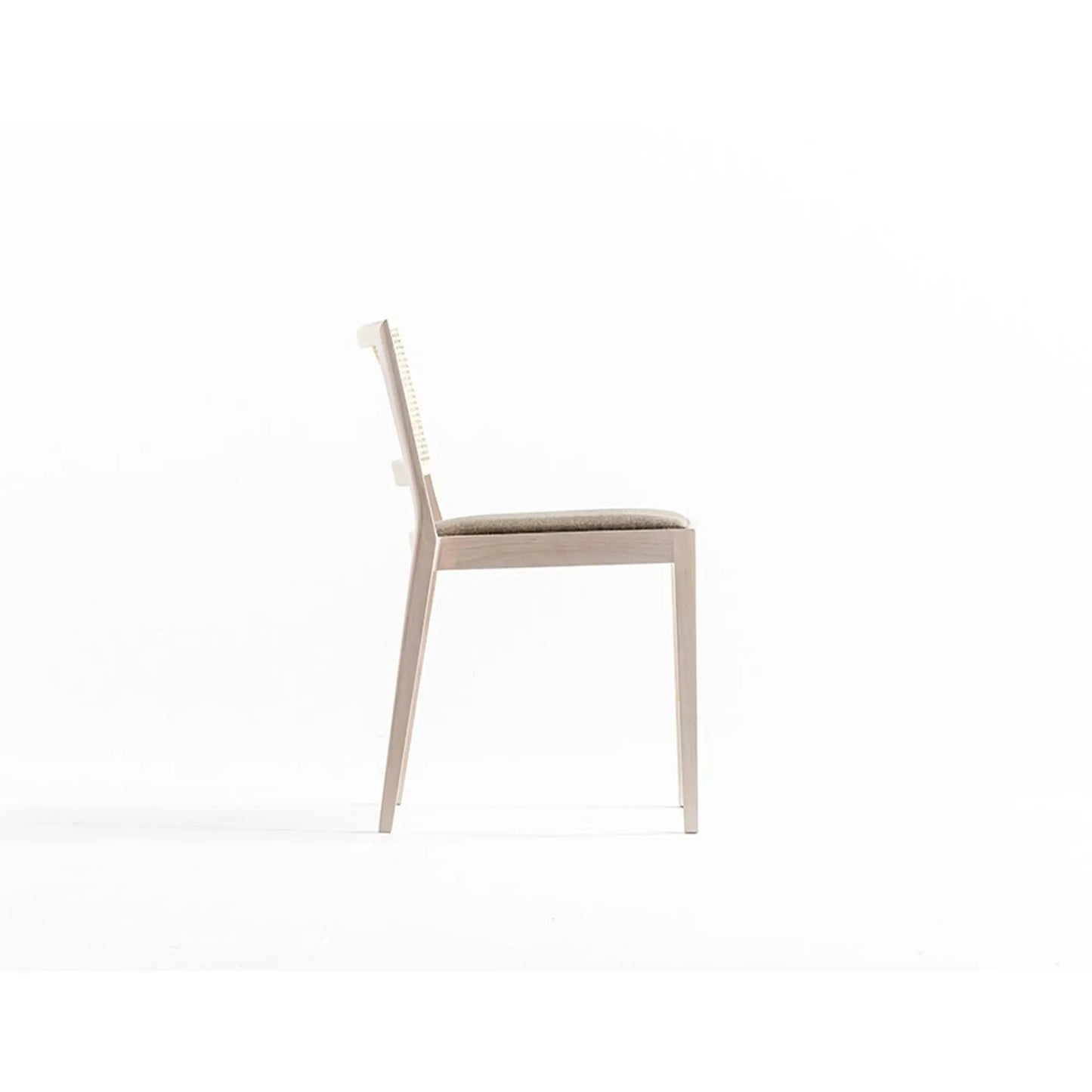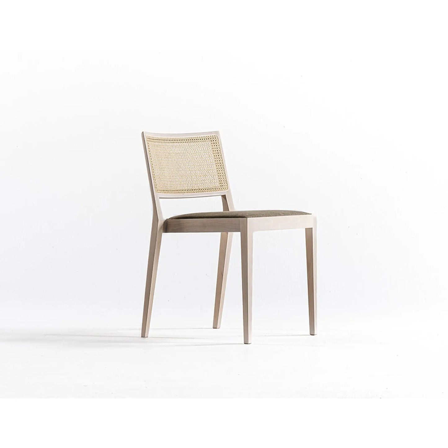 Frame in snow white or grey charcoal-stained solid beechwood; padded seat with cover in grey fabric or dark brown leather; straw backrest with natural cane bark.