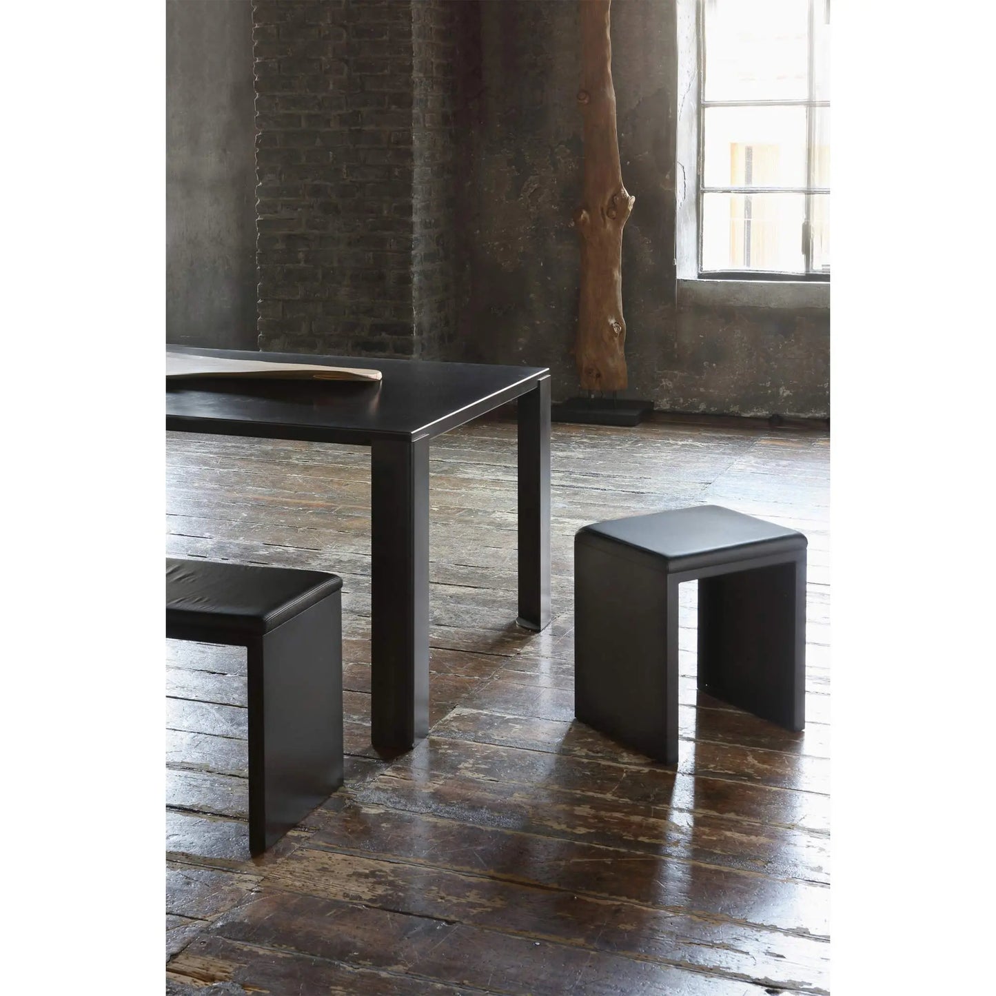 Table. Demountable frame. Top and legs 100x100mm | 3.9x3.9in in bent sheet steel. Black phosphatized finish, final fixing with bees’ wax.