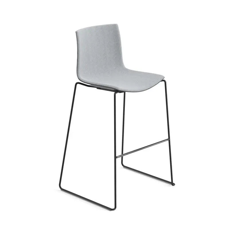 Stool with chromed or powder-coated steel sled base and polypropylene shell front upholstery in leather, coated fabric, fabric or customer’s own materials. Seat height 29 7/8". Optional glides with felt for wooden floors are available upon request.
