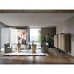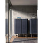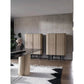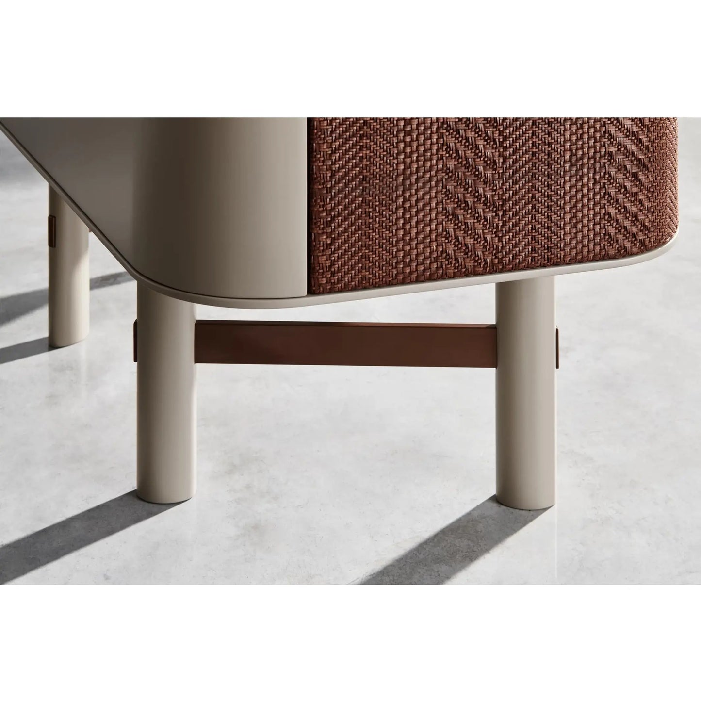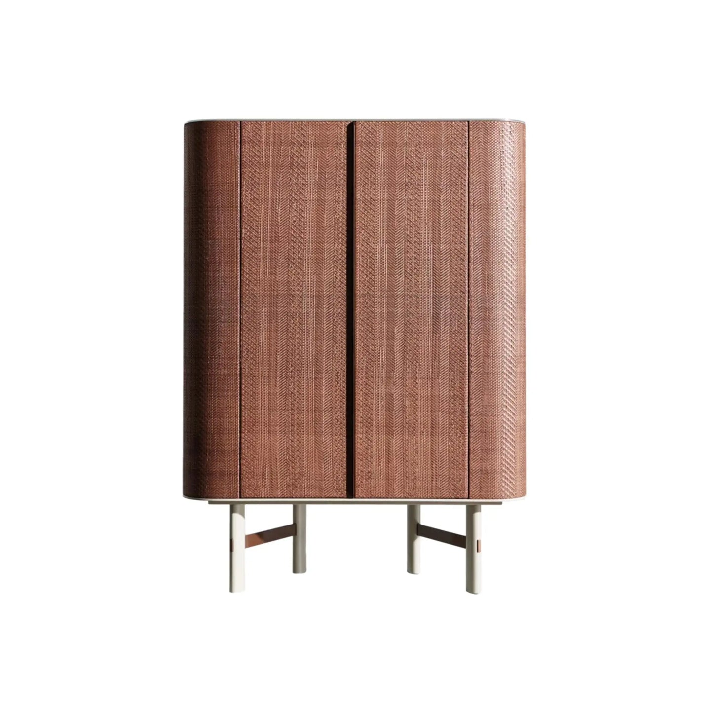 Highboard with plywood body and lacquered MDF. Comes in date, blueberry, and ginger colors. Four doors upholstered in water-repellent and cleanable eco-leather in Vibes Azul, Vibes Moreno or Vibes Arena. One internal adjustable shelf. Elliptical section legs made of solid wood available in lacquered date, blueberry or ginger, and connected by steel bars available in titanium, cobalt or bronze colors.
