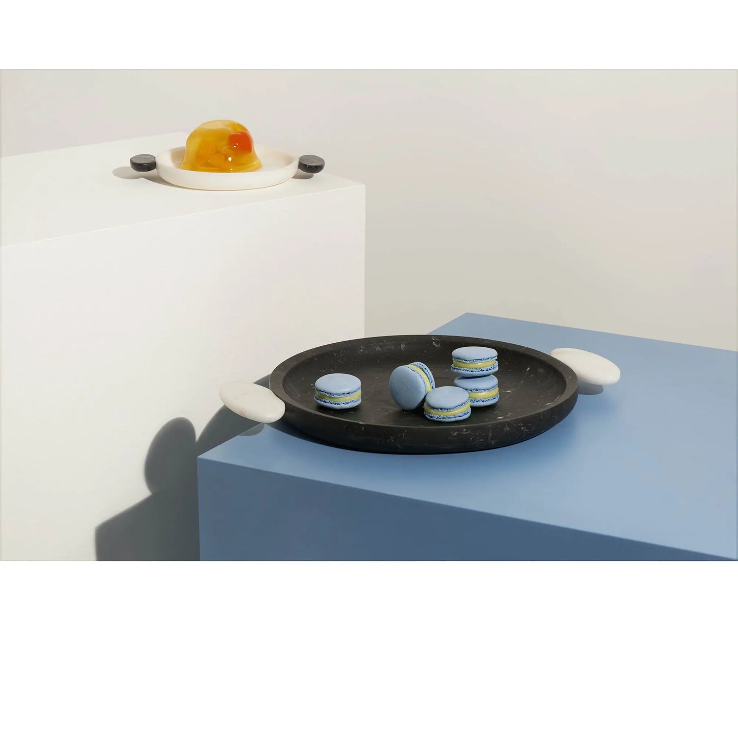 Serving is an intimate experience like taking care of one you love: a serving dish is all this, amusing in its shape, large, solid in the marble which is the black of nocturnal wanderings, the white of dedicated verses.