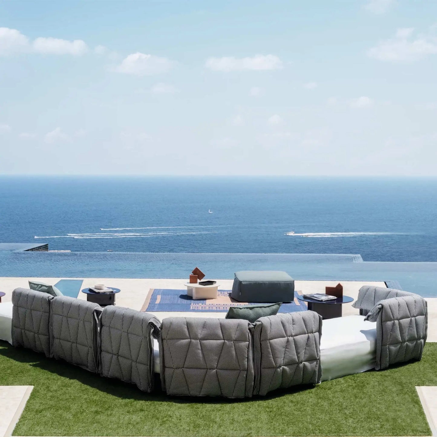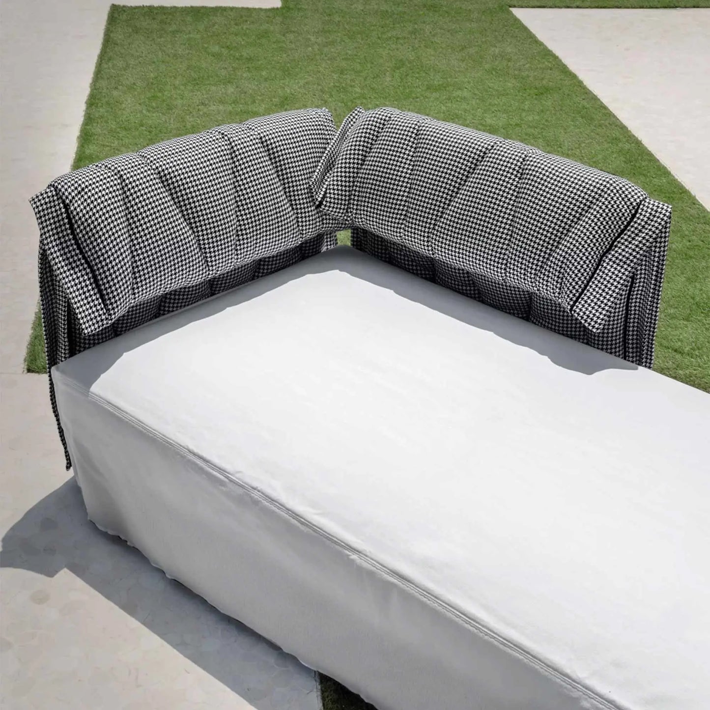 The Flair outdoor modular sofa is characterized by a backrest with a double hinge that can be flipped down manually, and individually for each seat. It's covered with a quilted outdoor fabric with overlock stitching detail. It's this detail that defines and enlivens the skyline of the product, allowing for double heights on individual backrests.