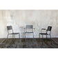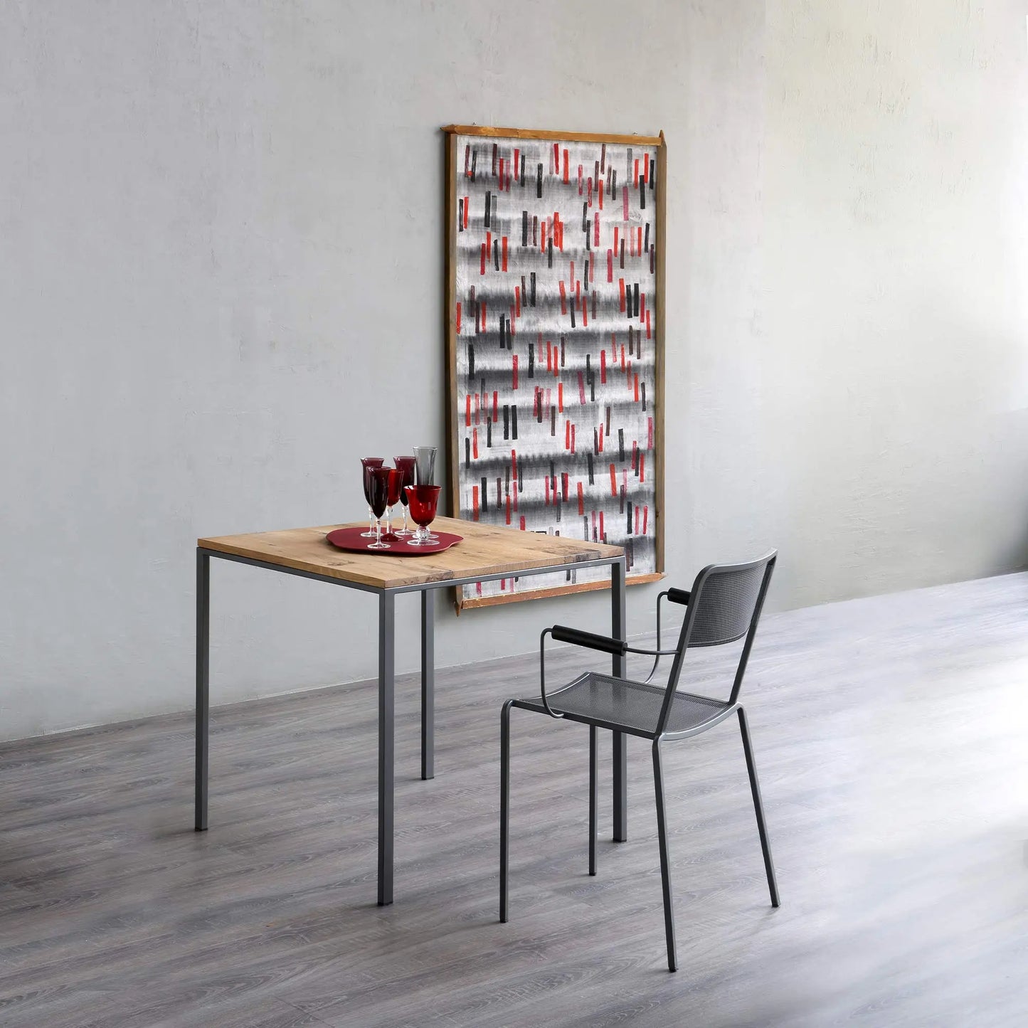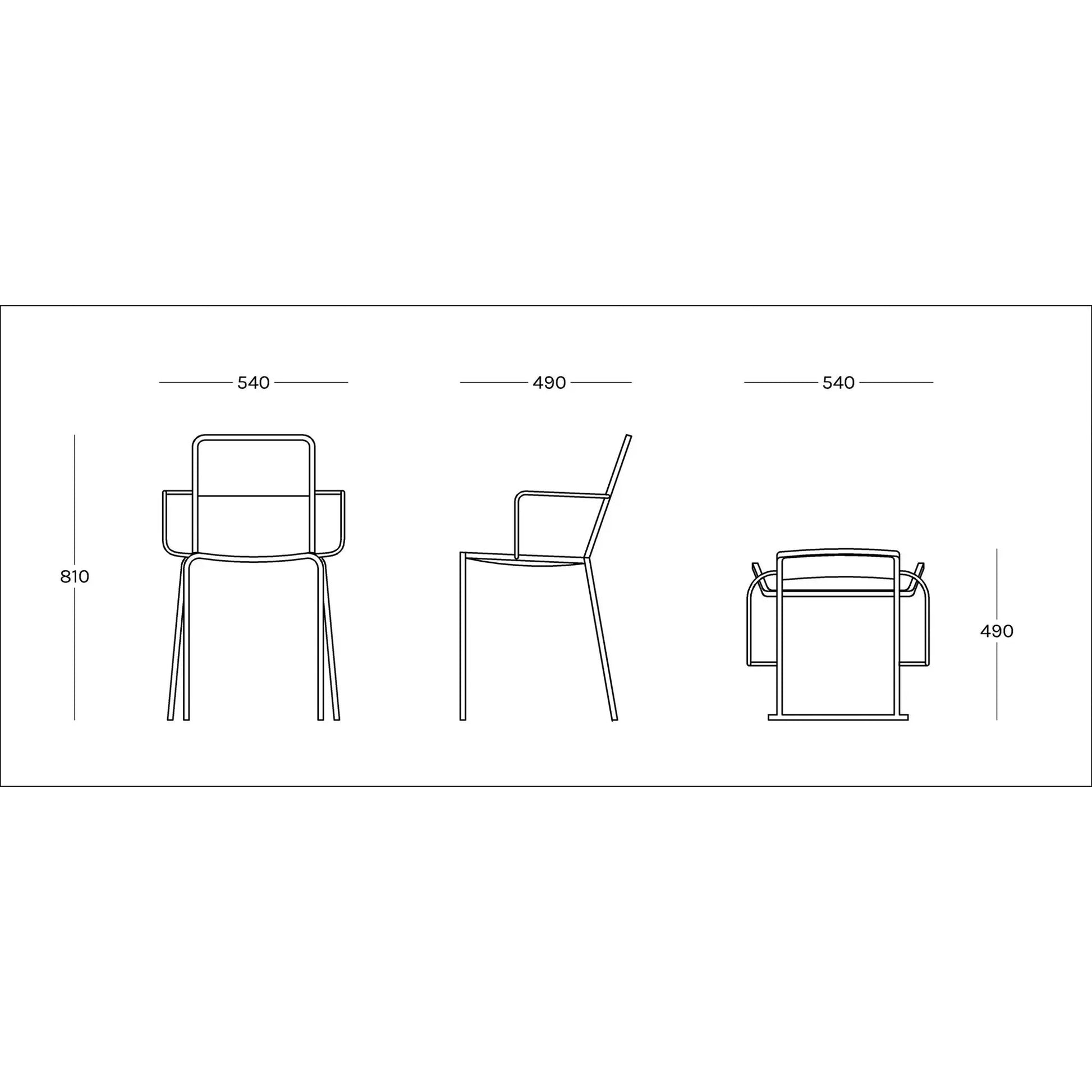 Stackable chair and armchair. Square steel tube frame 15x15mm. Seat and back in perforated sheet, epoxy painted copper black sand-touch or micaceous grey. Arms in steel rod and black extruded rubber.