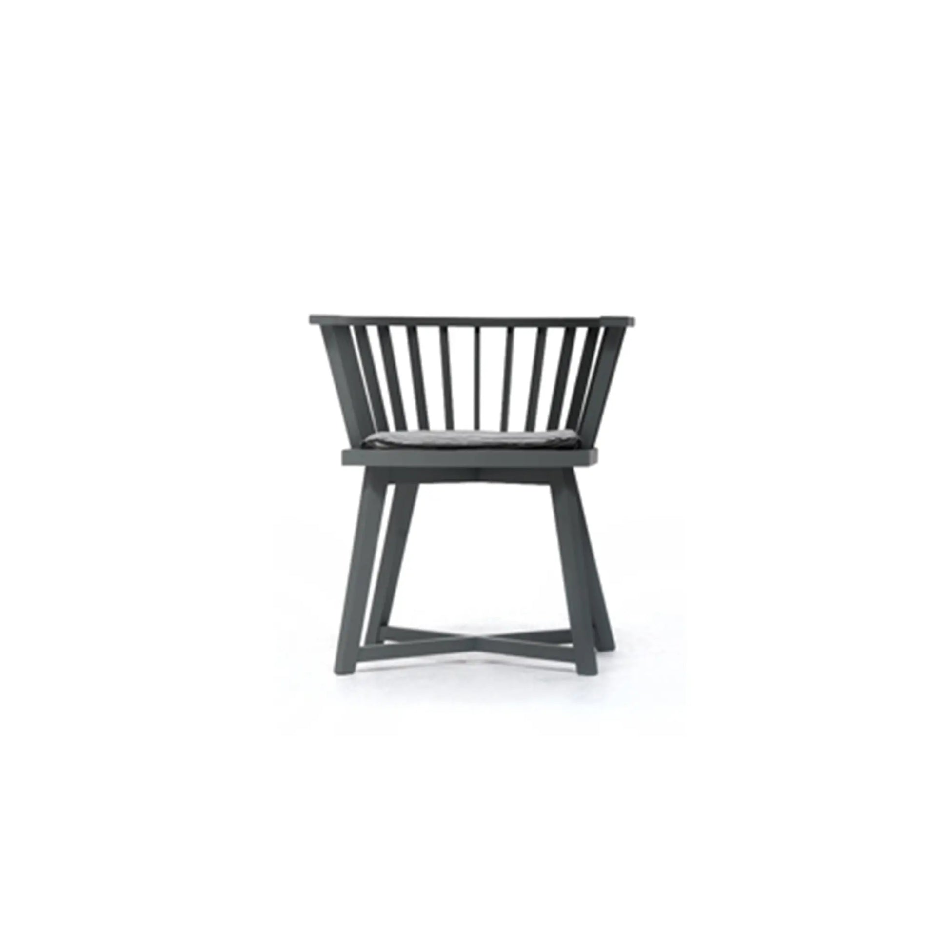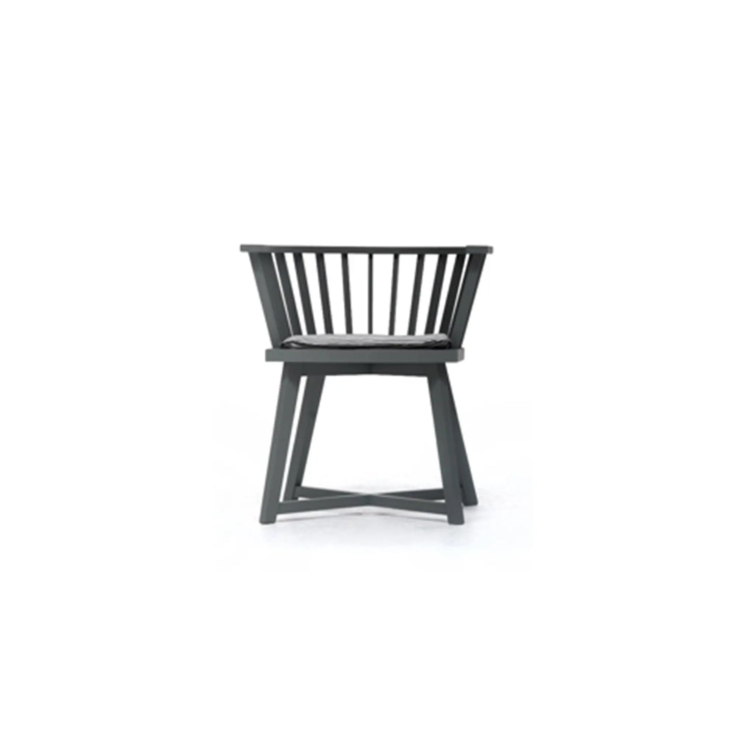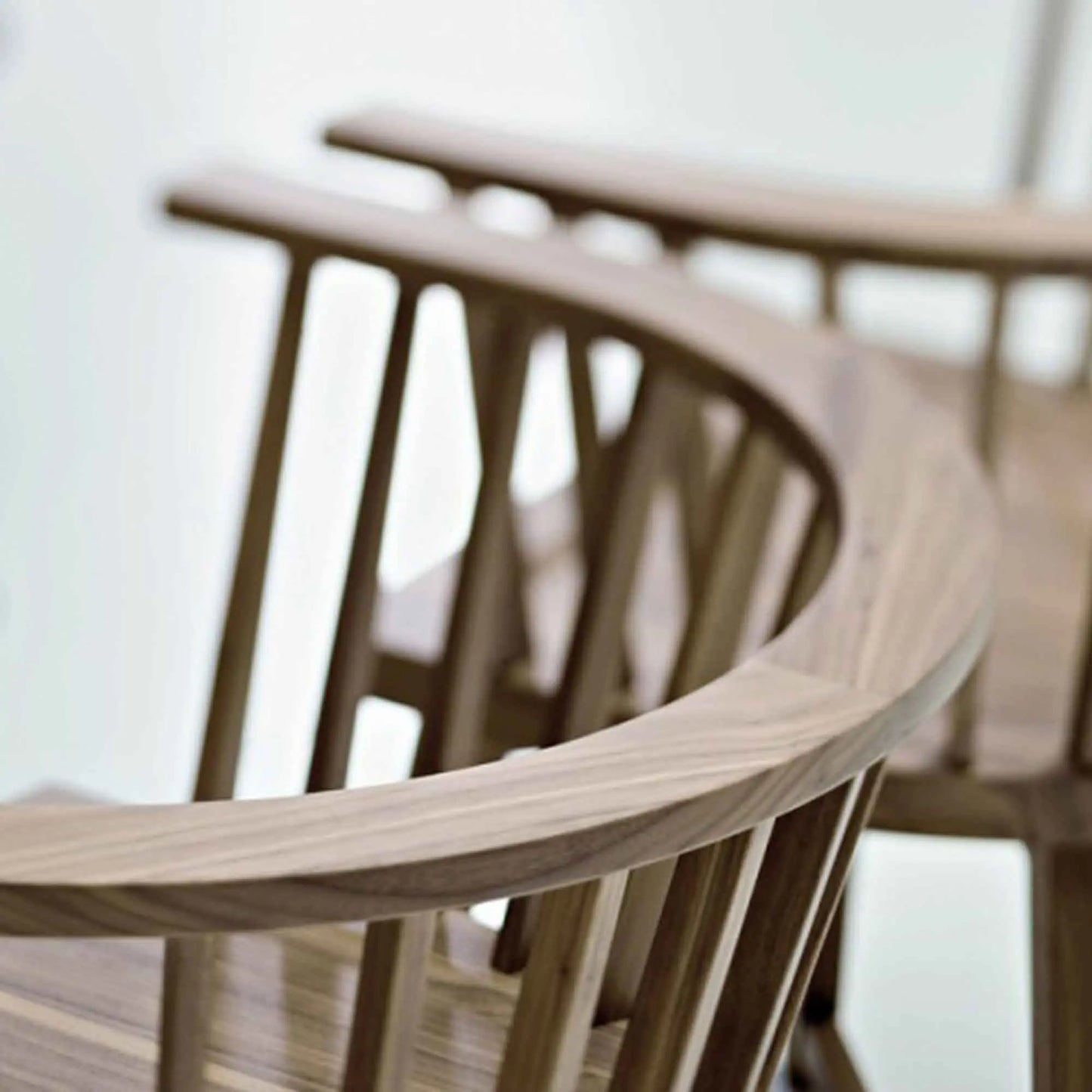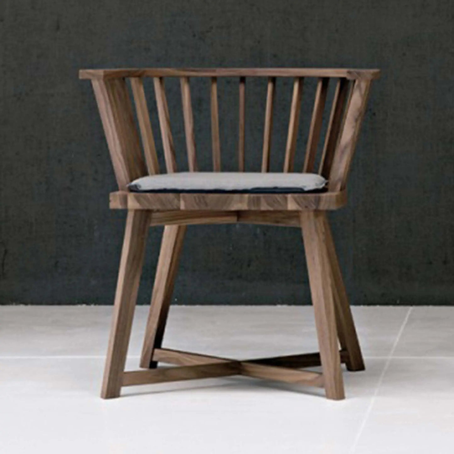 Gervasoni's Gray 24 is a wooden dining armchair with an enveloping low backrest in the shape of a semicircle made with slats. The solid wood legs intersect, forming a cross. For greater comfort, optional seat and back cushions accentuate its softness.