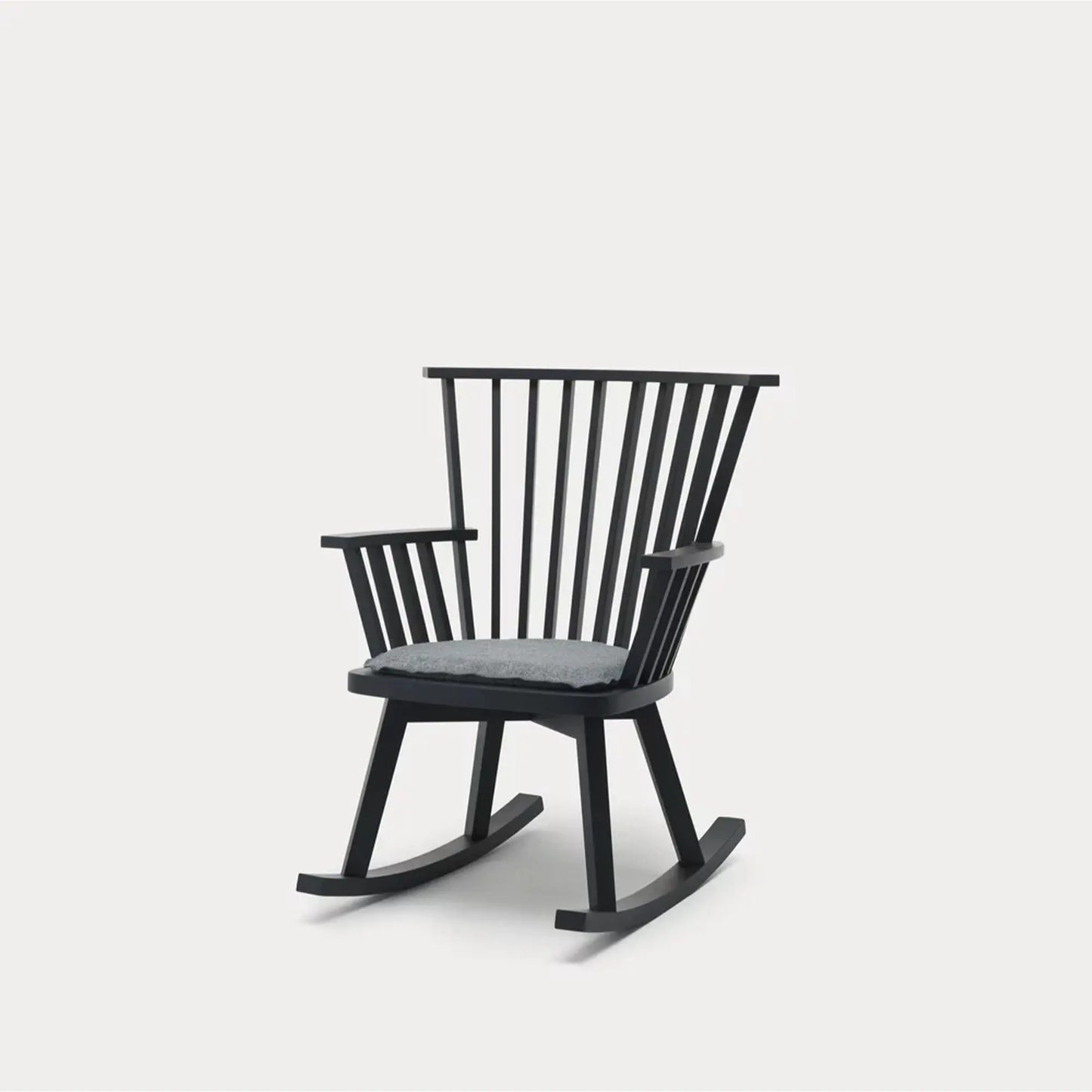 A wooden rocking chair, Gervasoni's Gray 29 has a curved design that evokes the classic Nordic style. It features a backrest with wooden slats that create an interplay of solids and voids. It boasts a pleasant contrast between the minimal design of the walnut or oak frame and the softness of the optional seat cushion for added comfort.