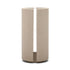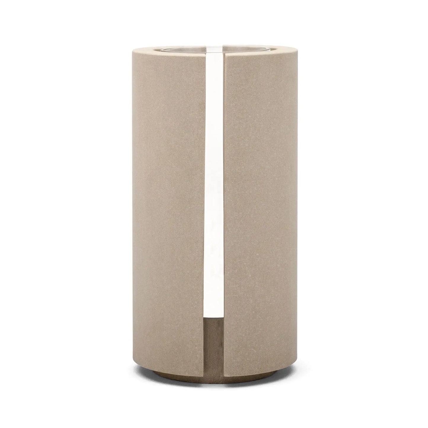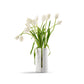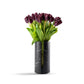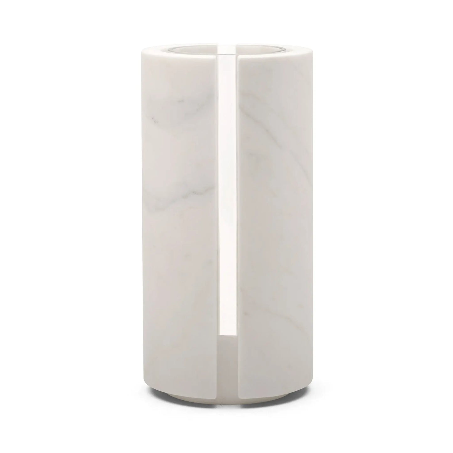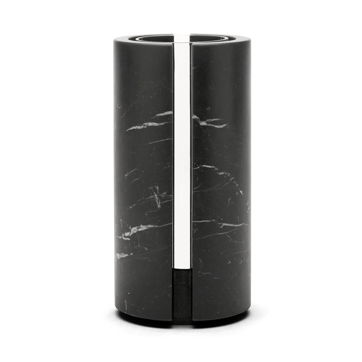 A sculptural form in white, black marble, limestone, glass vase inside.