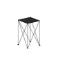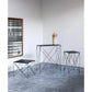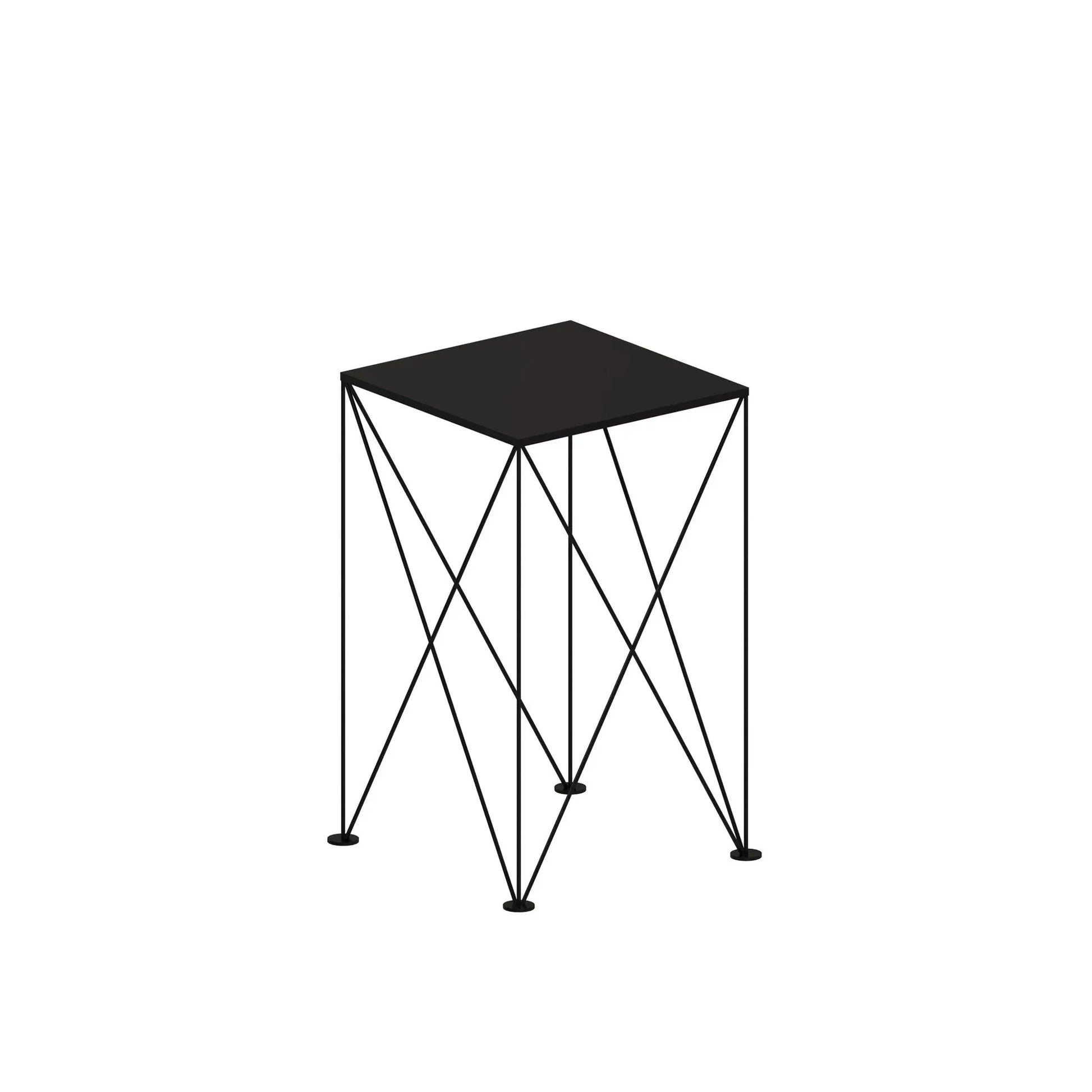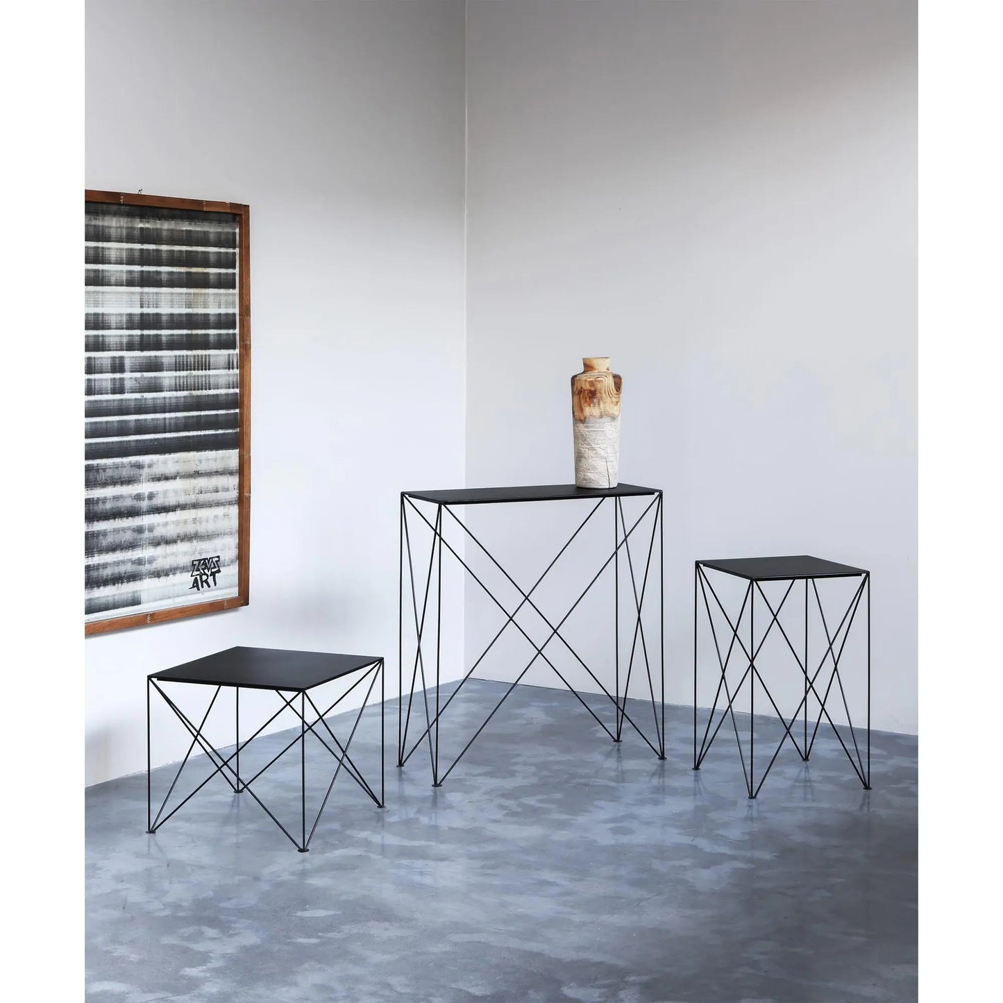 Console in two heights. Cross welded frame in 6mm (Ø) iron rod. Ring shaped feet in 38mm (Ø) steel plate. Sheet steel top 1.5mm thick. Epoxy painted copper black sand- touch or metal brown.