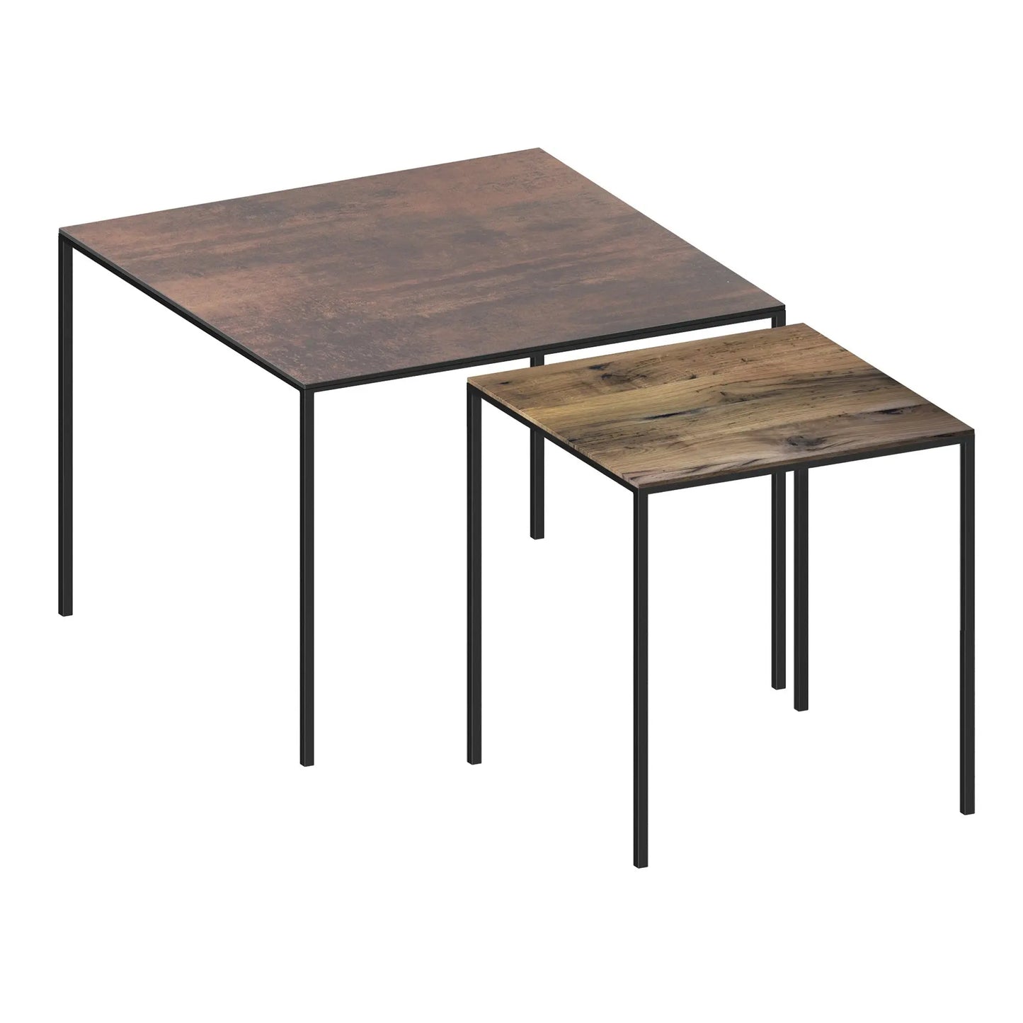 Wood: Table. Steel tube frame 20x30mm, epoxy painted embossed black. 20mm top in solid aged oak wood with transparent resin leveling. Special top and sizes available on request.