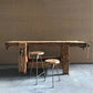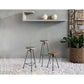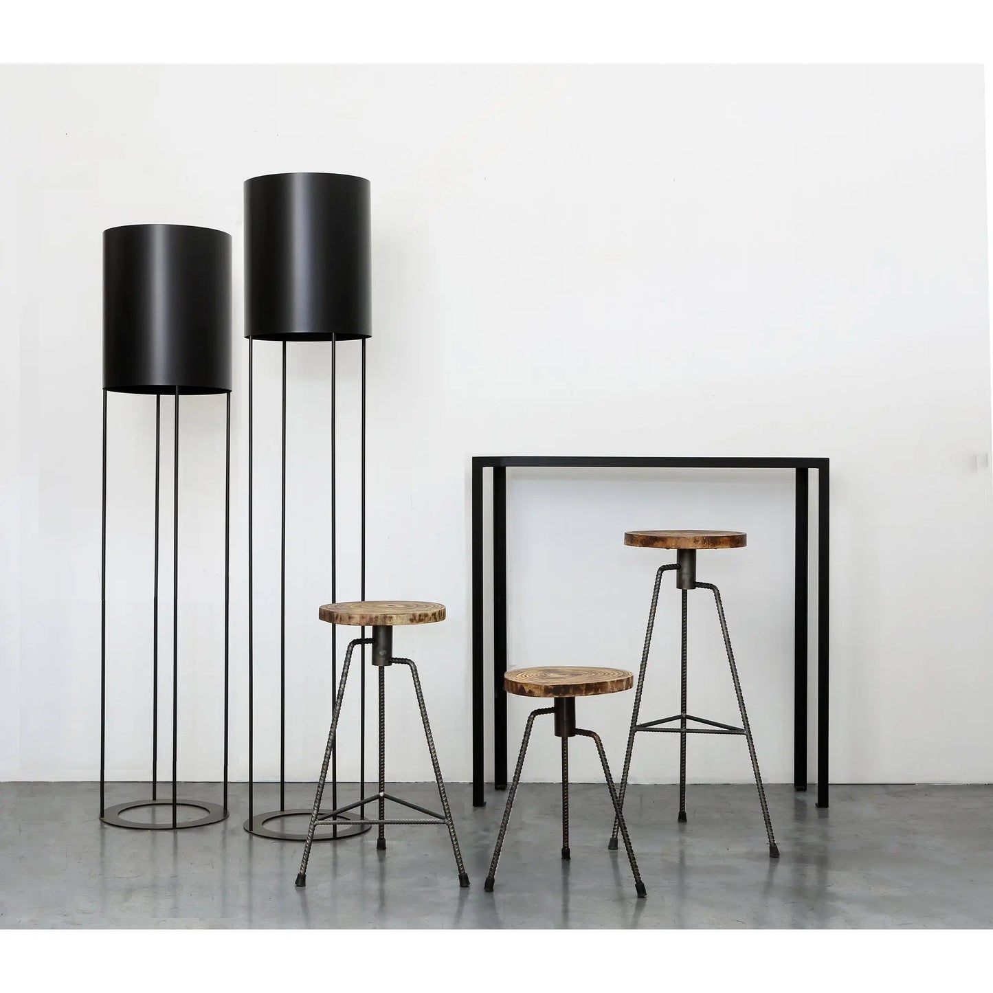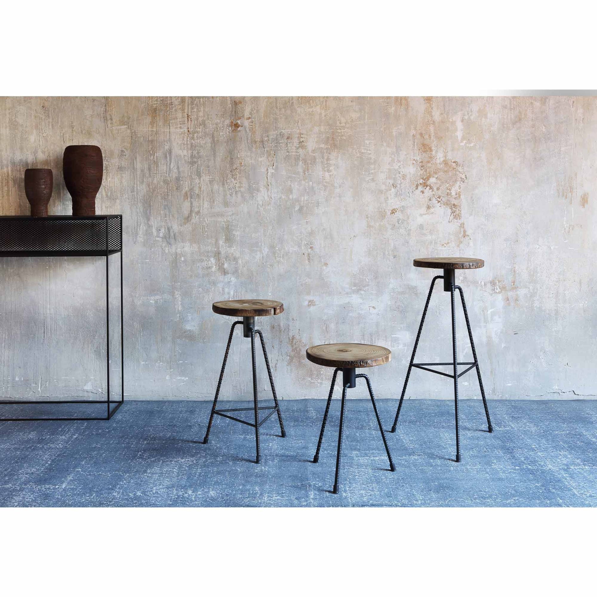 Barstool and stool. Frame in Ø12mm ribbed steel rod. Natural iron with opaque transparent painting. Alternative version epoxy painted copper black sand-touch. Seat in massive tree trunk section with transparent finish.