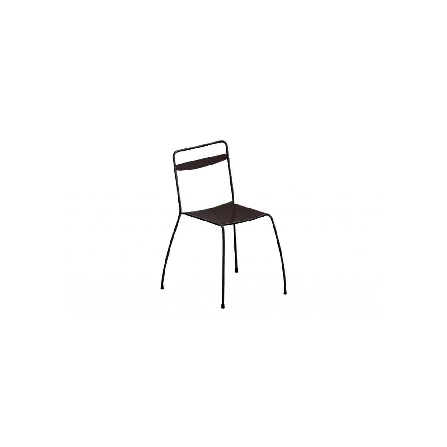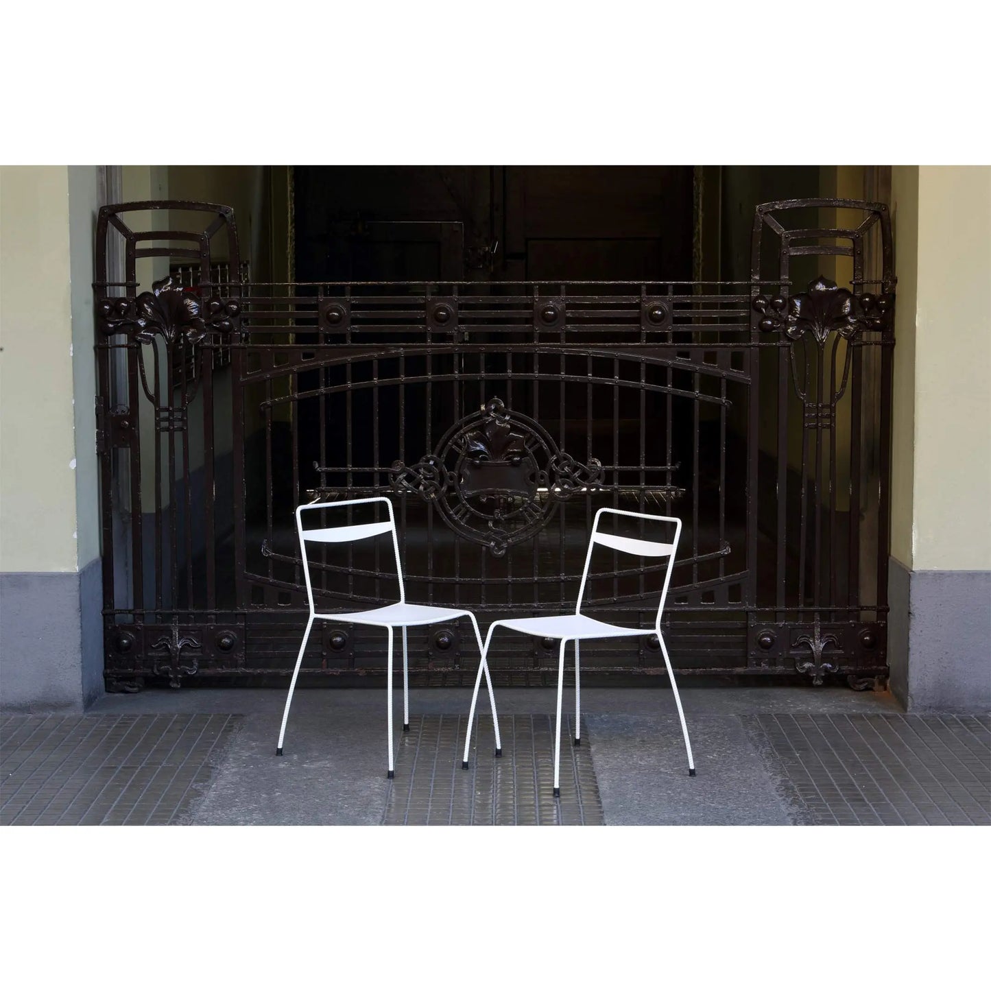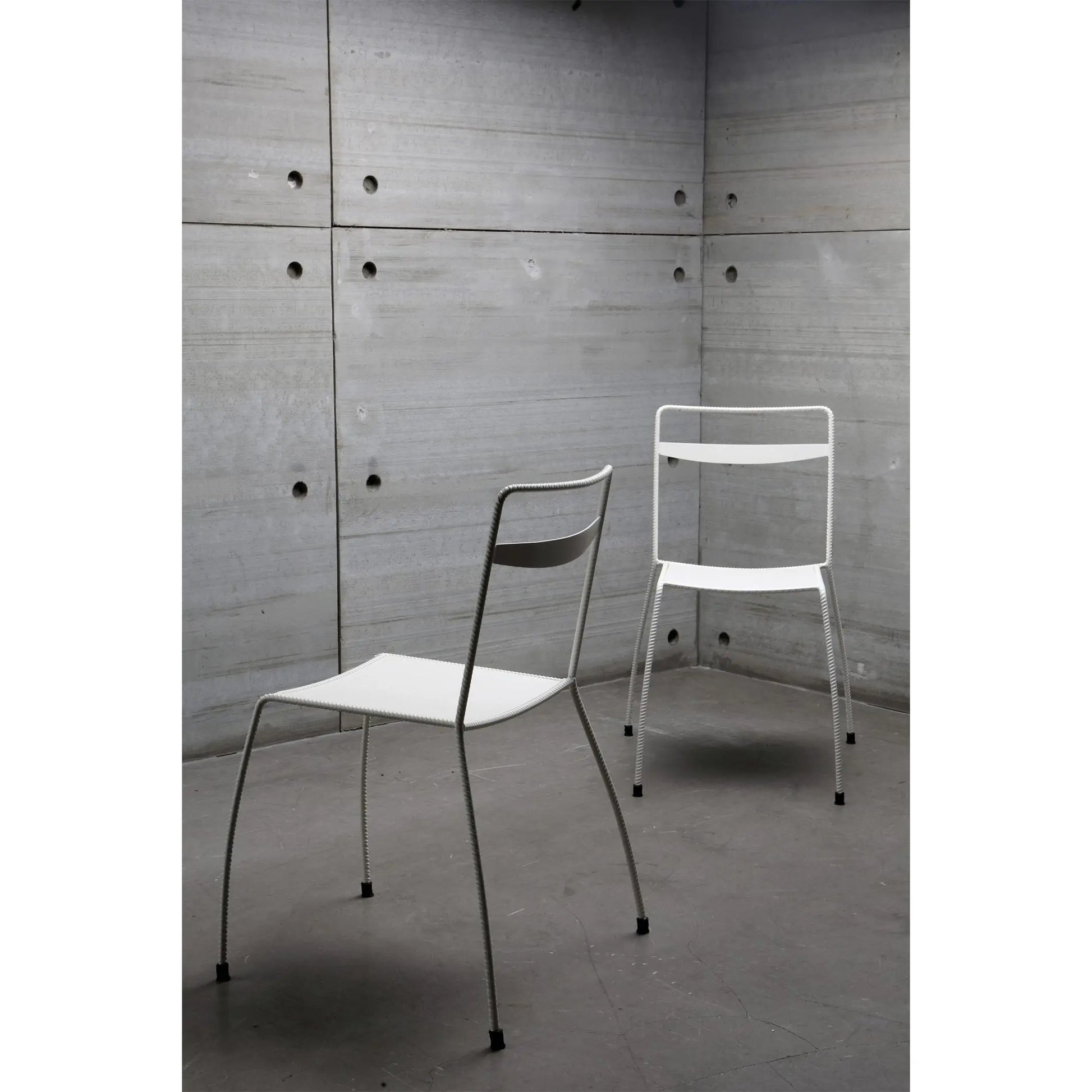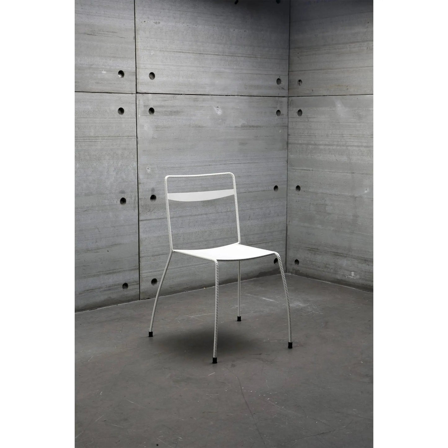 Stackable chair. Frame in Ø 12mm | 0.47in ribbed steel rod. Seat and back in 15mm | 0.6in laser cut sheet steel. Treated for outdoor and polyester epoxy painted metal.
