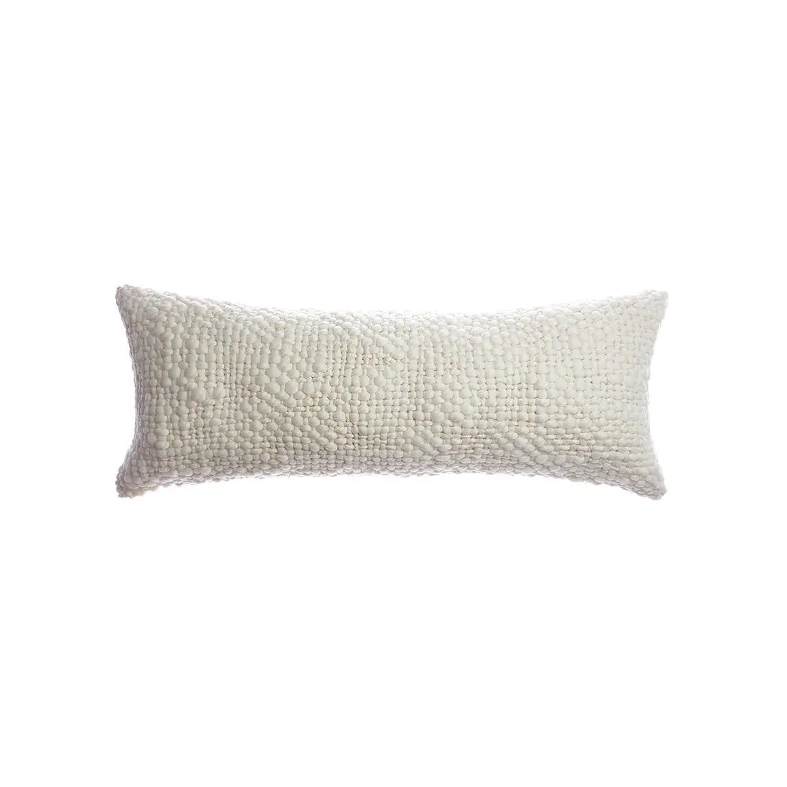 Super soft natural merino wool creates a gorgeous, one-of-a-kind look on this cable knit throw bed lumbar pillow. Volumes of chunky superfine merino wool yarn have been loosely hand knitted together into tighten chunky knots that resemble small fluffy clouds. Backed with white natural linen and finished with a hidden zipper closure.