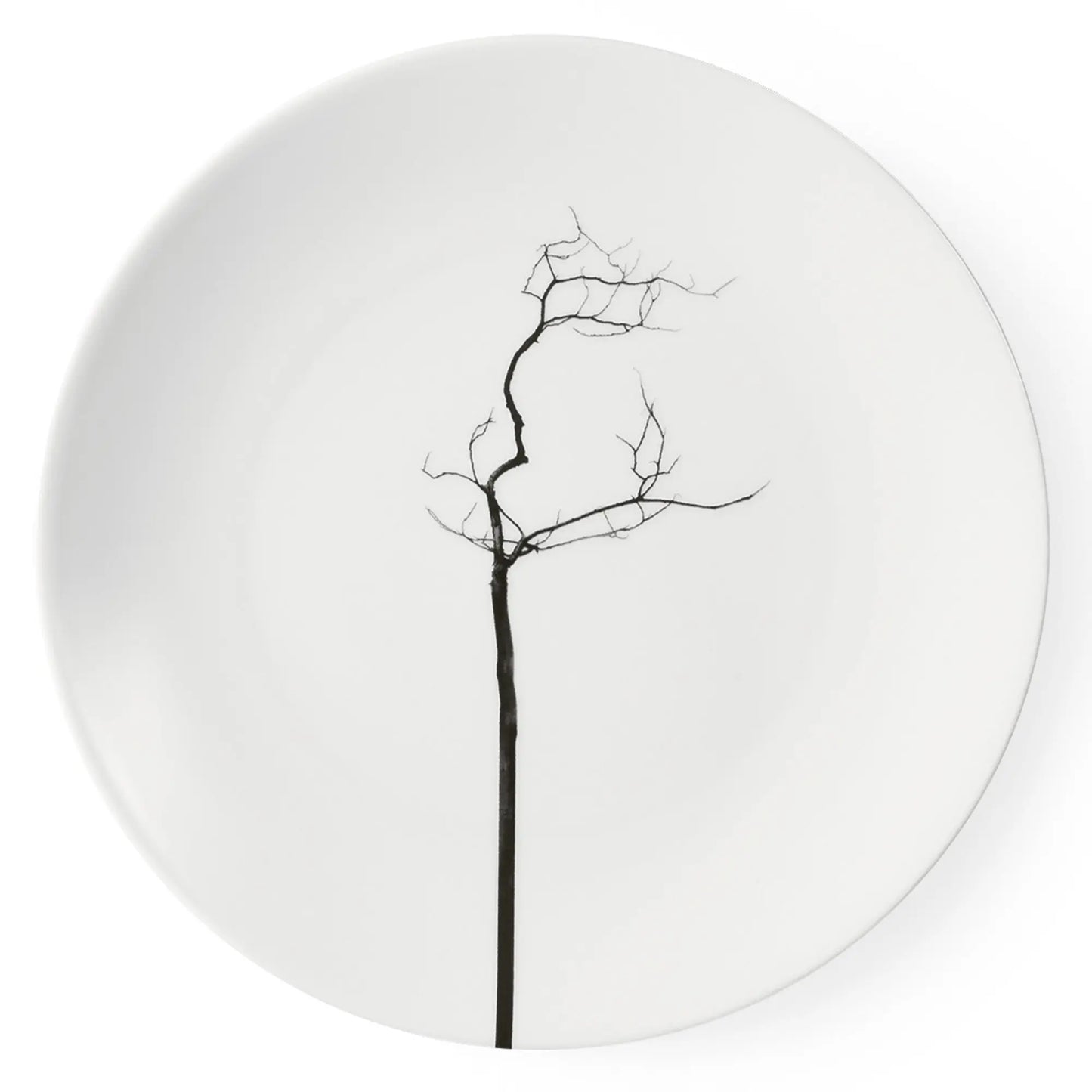 The Black Forest Dessert Plate (21cm | 8.3in), produced by Dibbern, is a striking example of contemporary porcelain design. Created by Bodo Sperlein, the decor features a graphic, leafless tree silhouette that stands in bold contrast to the pure white Fine Bone China.