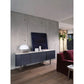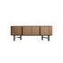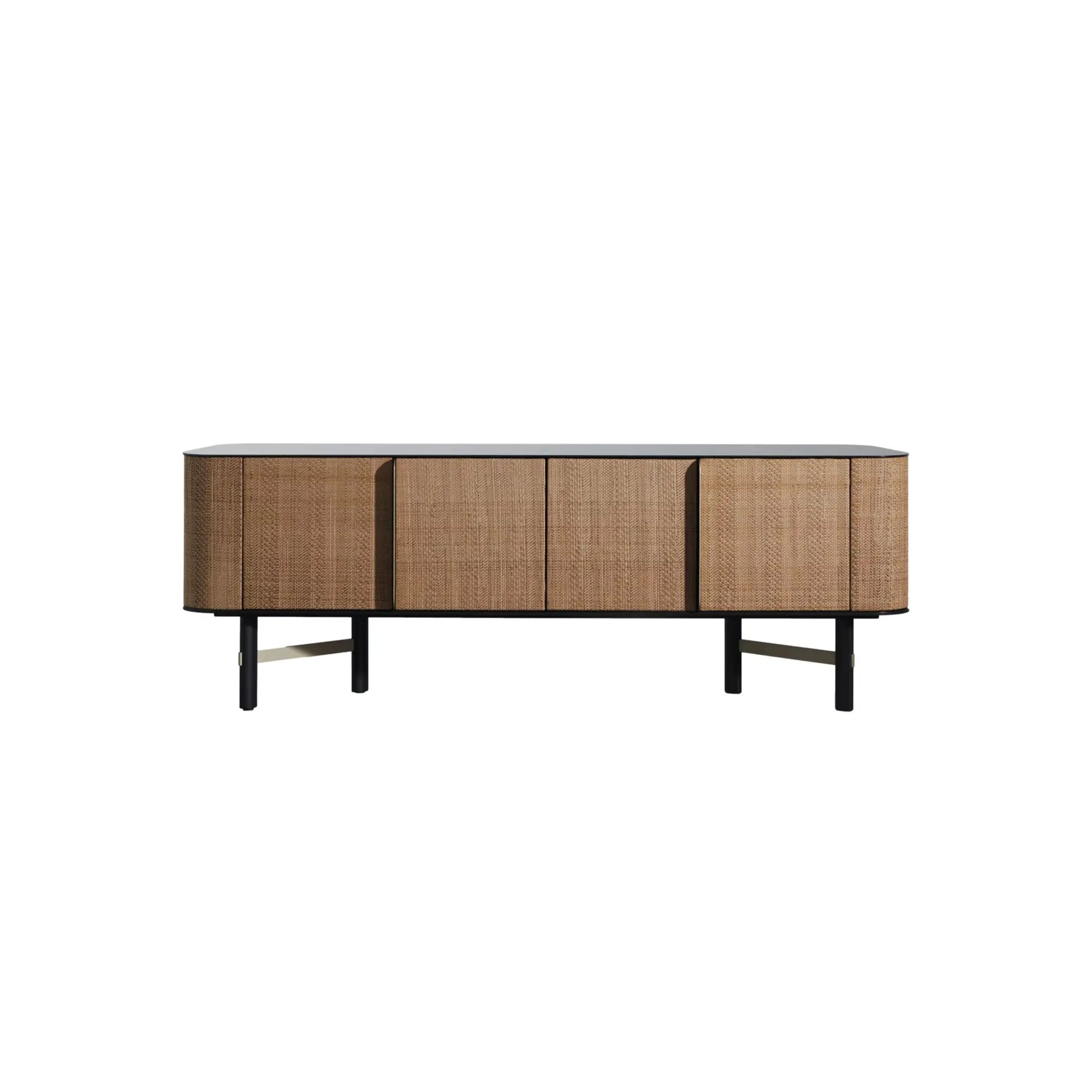 Sideboard with plywood body and lacquered MDF in date, blueberry, ginger colors. Four doors upholstered in water-repellent and cleanable eco-leather Vibes Azul, Vibes Moreno or Vibes Arena. One internal adjustable shelf. Elliptical section legs made of solid wood lacquered in date, blueberry, ginger colors and connected by steel bars in Titanium, Cobalt or Bronze colors. Steel handles in the same color of the bars.