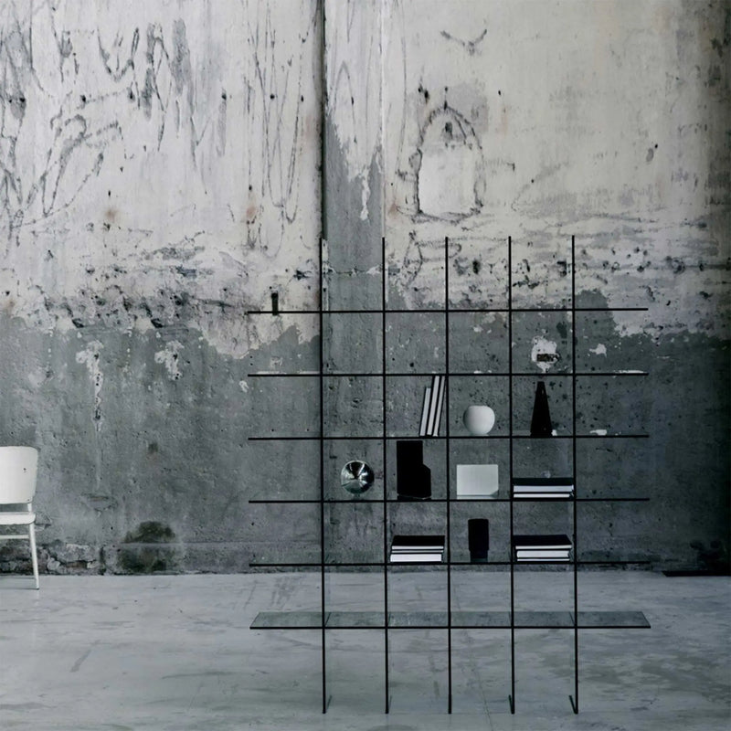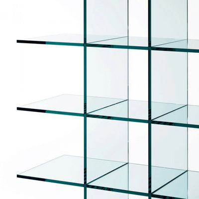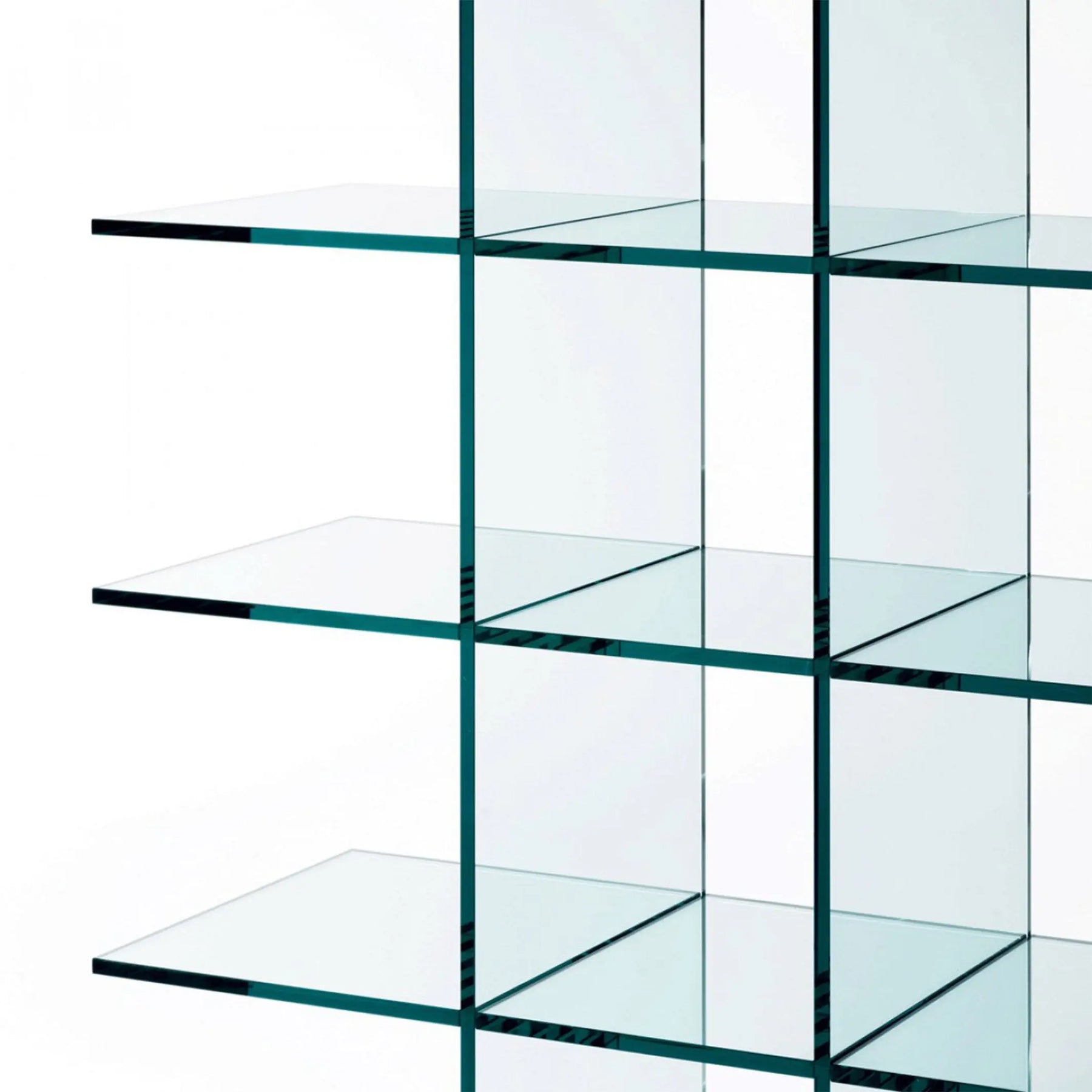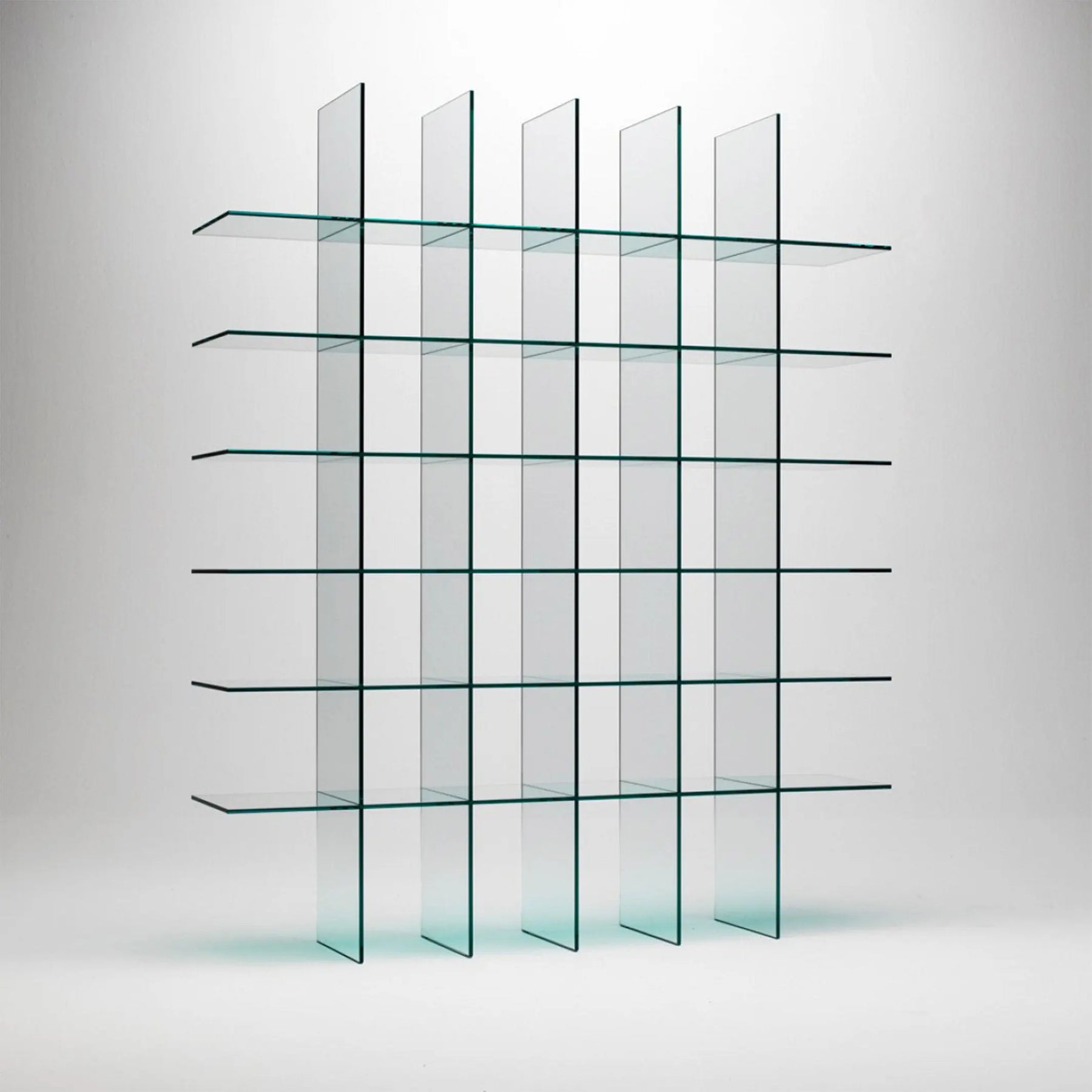 Bookcase characterized by the extraordinary formal cleanliness and the golden proportions, entirely realized in thermo-welded mm. 12 thick transparent glass, without the aid of any foreign element. Historical and iconic product of the international design, designed in 1976 by the great master Shiro Kuramata.