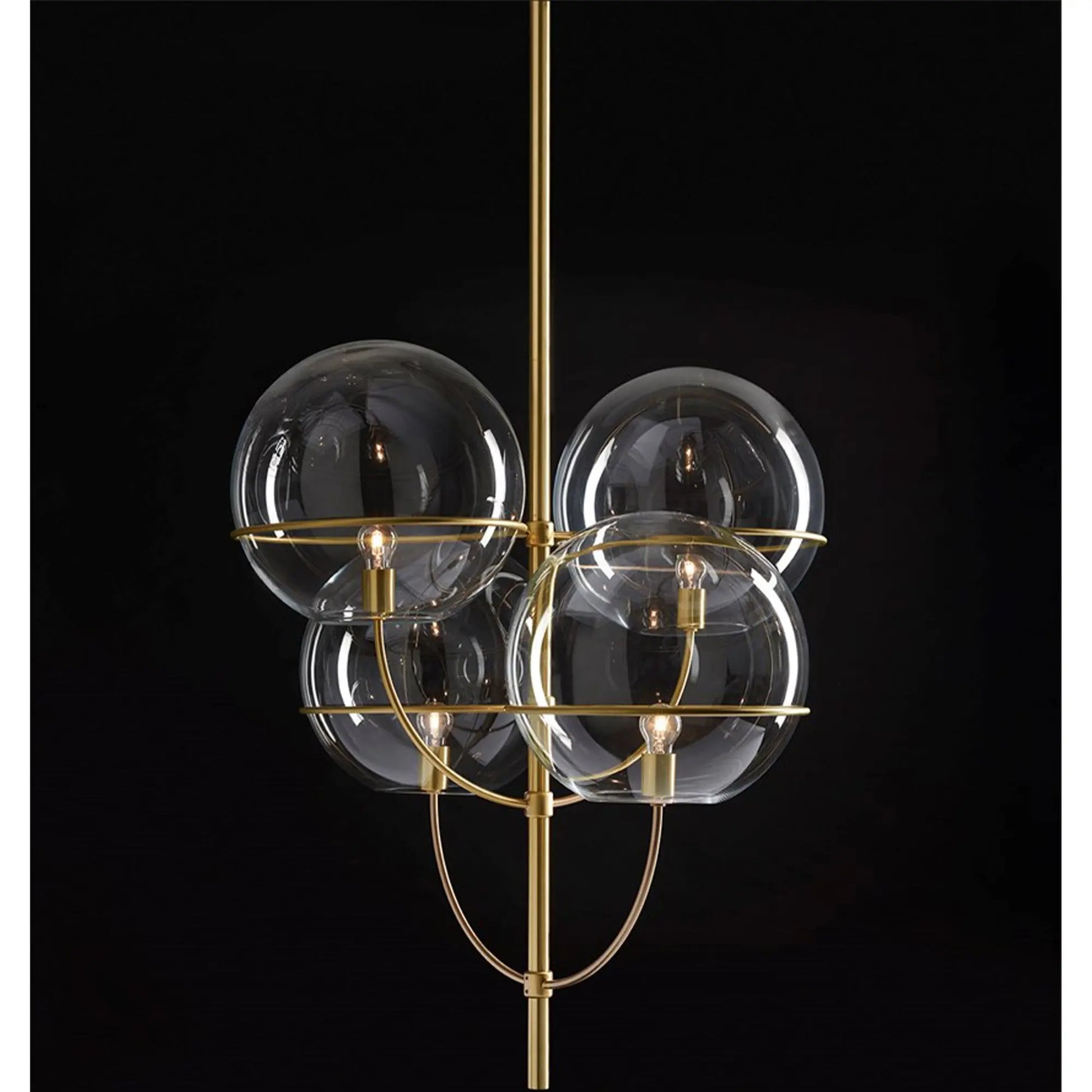 The chrome-plated finished candelabra-style body, typical of the family of lamps designed by Magistretti, can, from time to time be bent according to the required use of the lamp, extending to enclose the transparent glass spheres, inside which the light bulb is hosted.