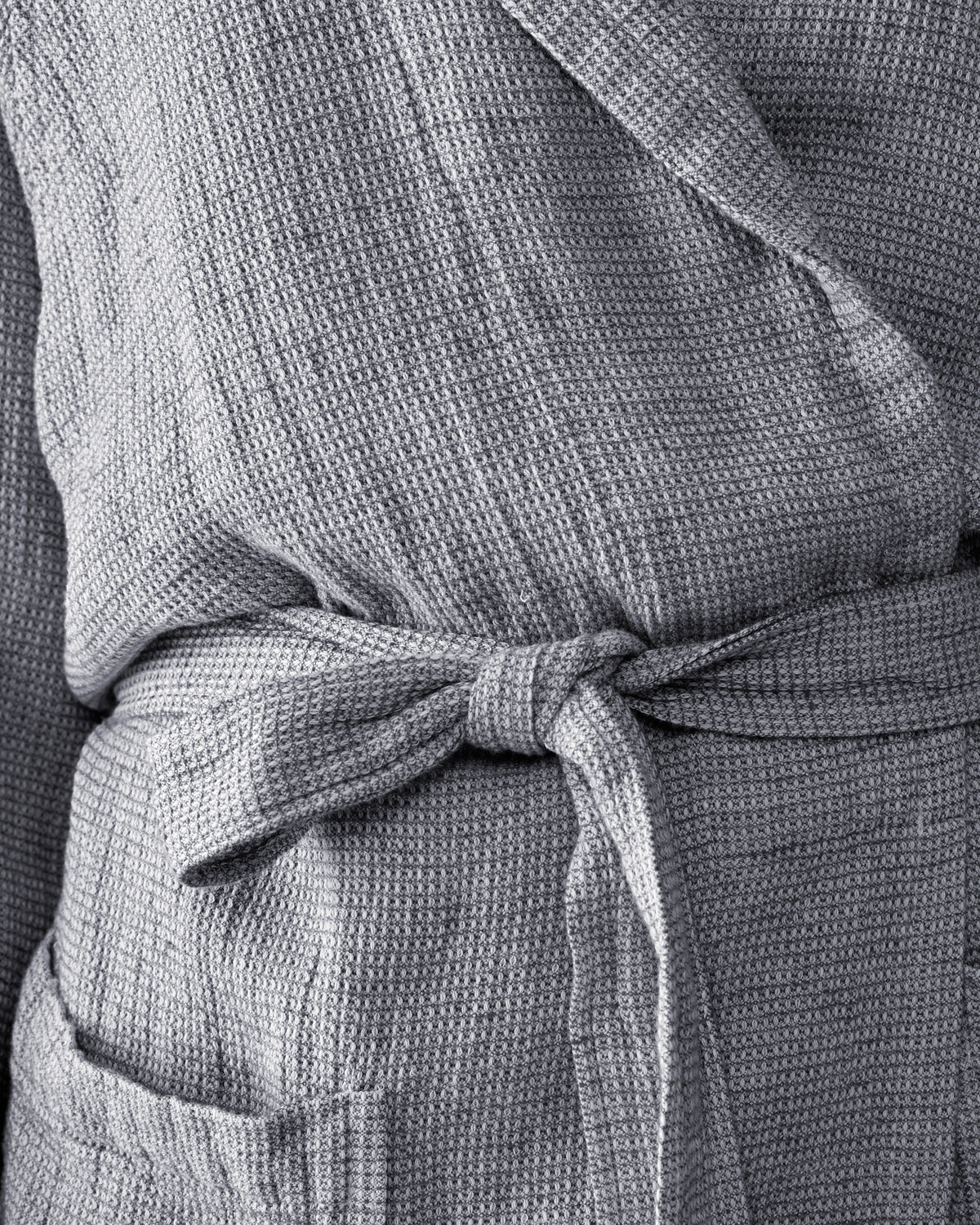 MACO bathrobe is produced from a refined mix of linen and cotton with honeycomb processing. This fresh and light fabric, the product of crossing colored and white yarns, creates an elegant mélange effect.
