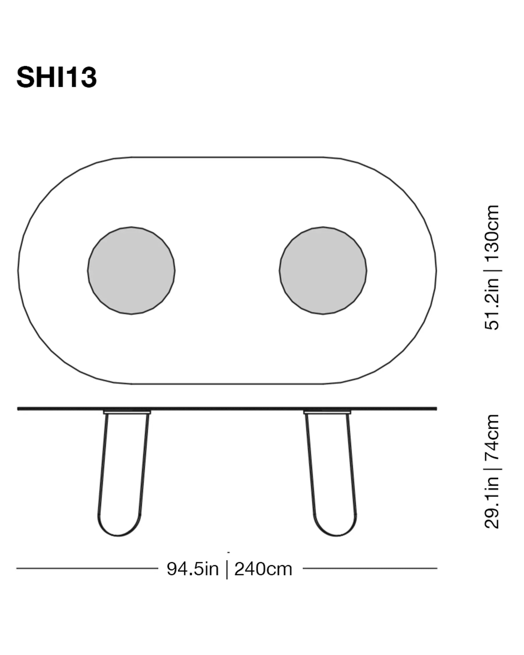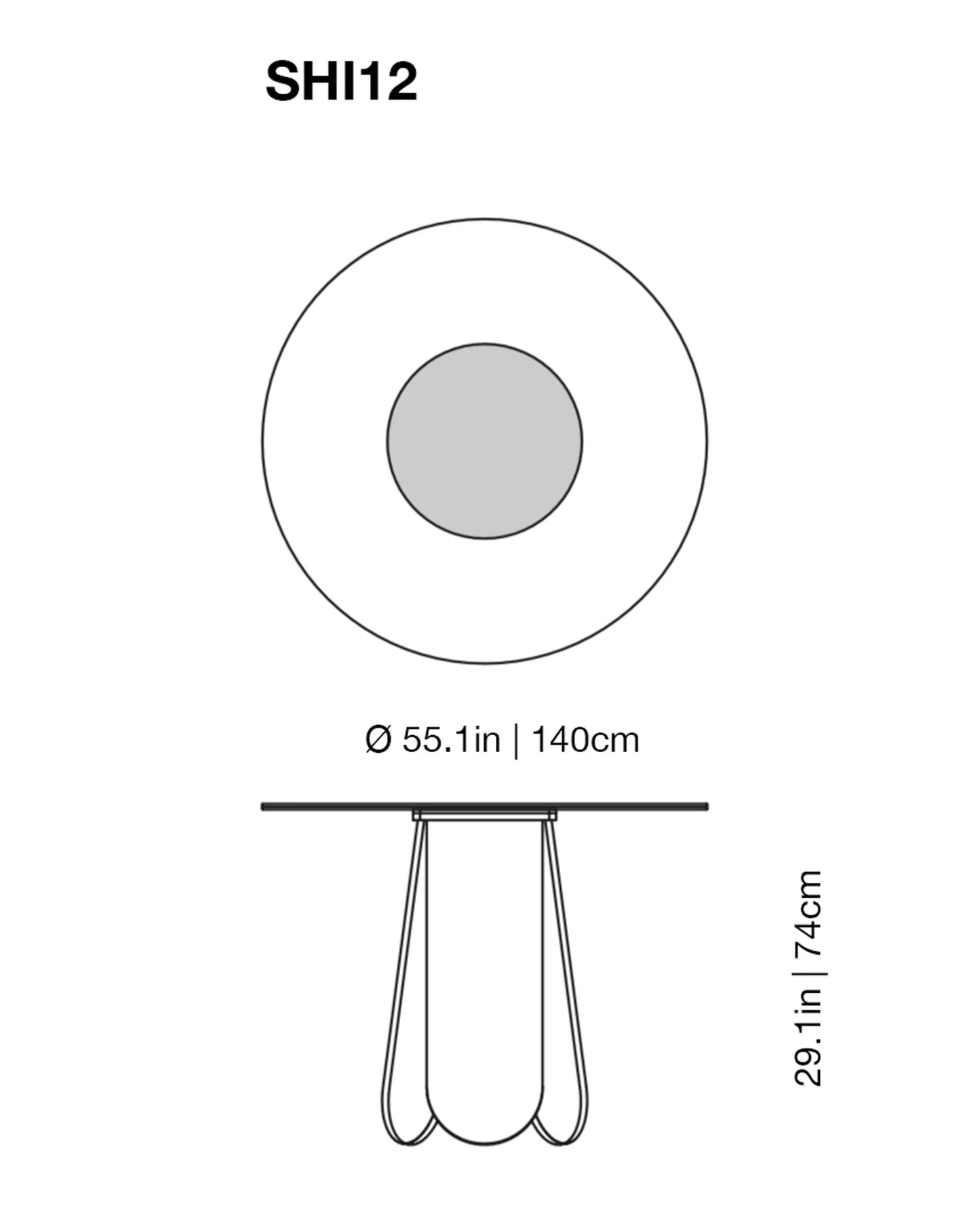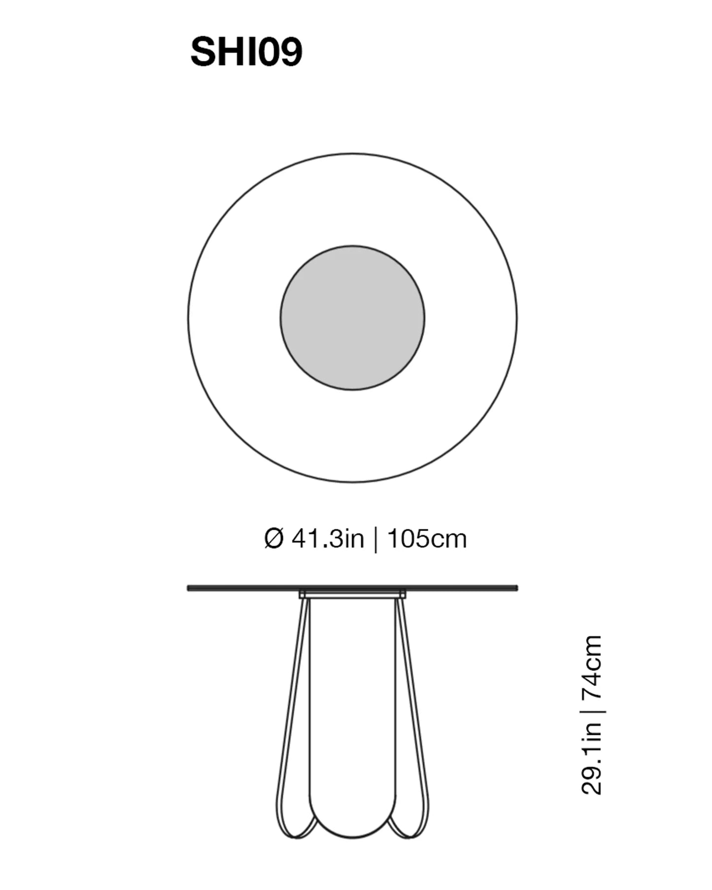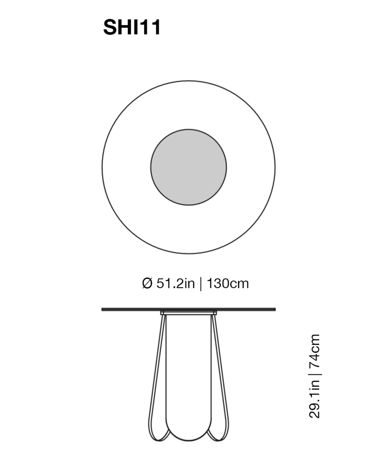 High tables, low tables and consoles in laminated and glued glass, characterized by a special iridescent multichromatic finish; the nuance varies according to the angle of the light source and the vantage point. Reflected objects with a magical and ethereal appearance emerge. For the codes from SHI01 to SHI13 in the low tables the legs are glued to the top, while in the high tables they are removable. The high tables bases can be dismantled and are fixed to the top by means of metal plates, concealed by a circular decorated covering. For the codes from SHI14 to SHI26 the top rests on the base. In the SHI23 console it is also fixed to the wall with metal brackets.