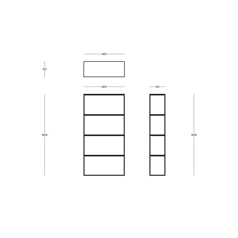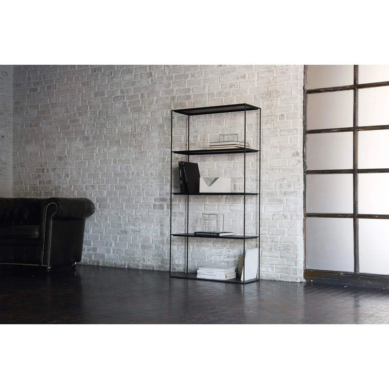 Rack with 5 shelves. Frame in solid drawn tube 8 x 8 mm and 2 mm sheet steel shelves, epoxy painted copper black sand-touch or embossed white. Usable space between shelves is 39 cm.
