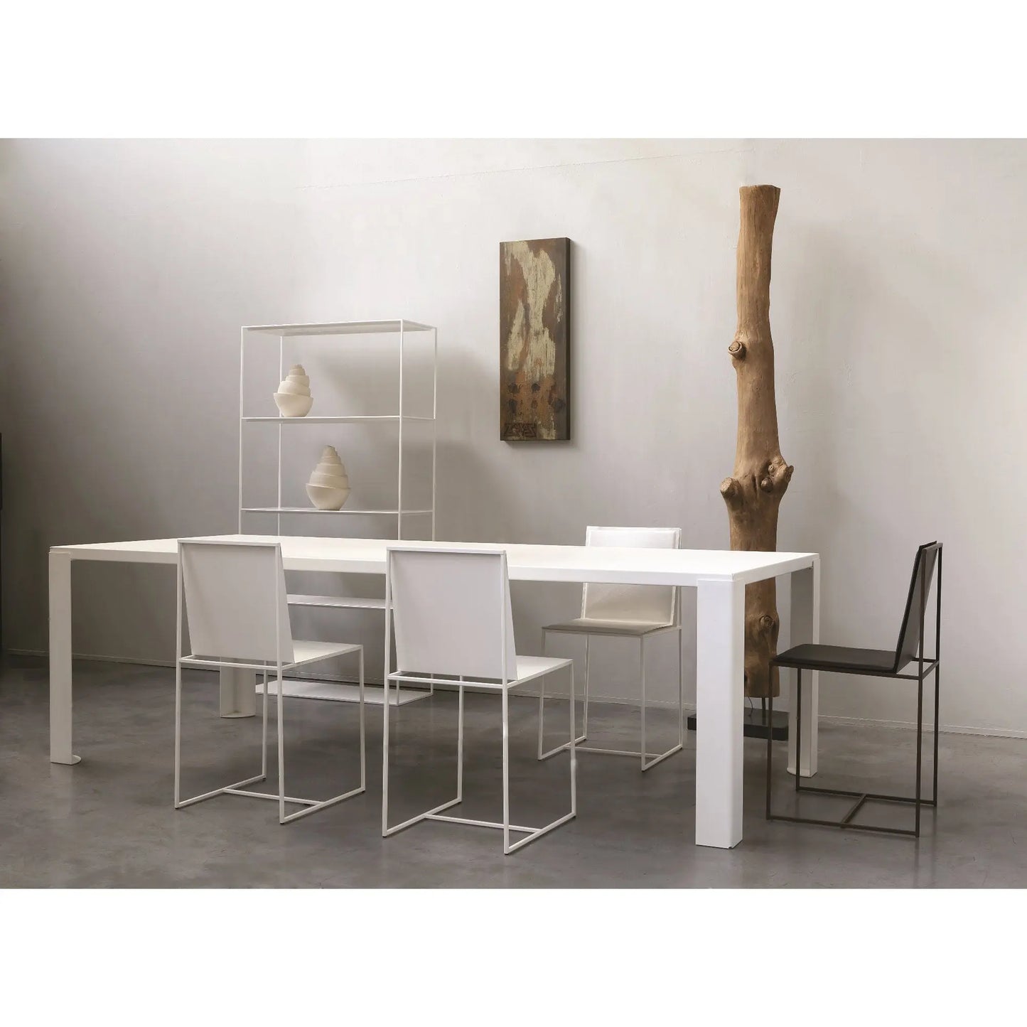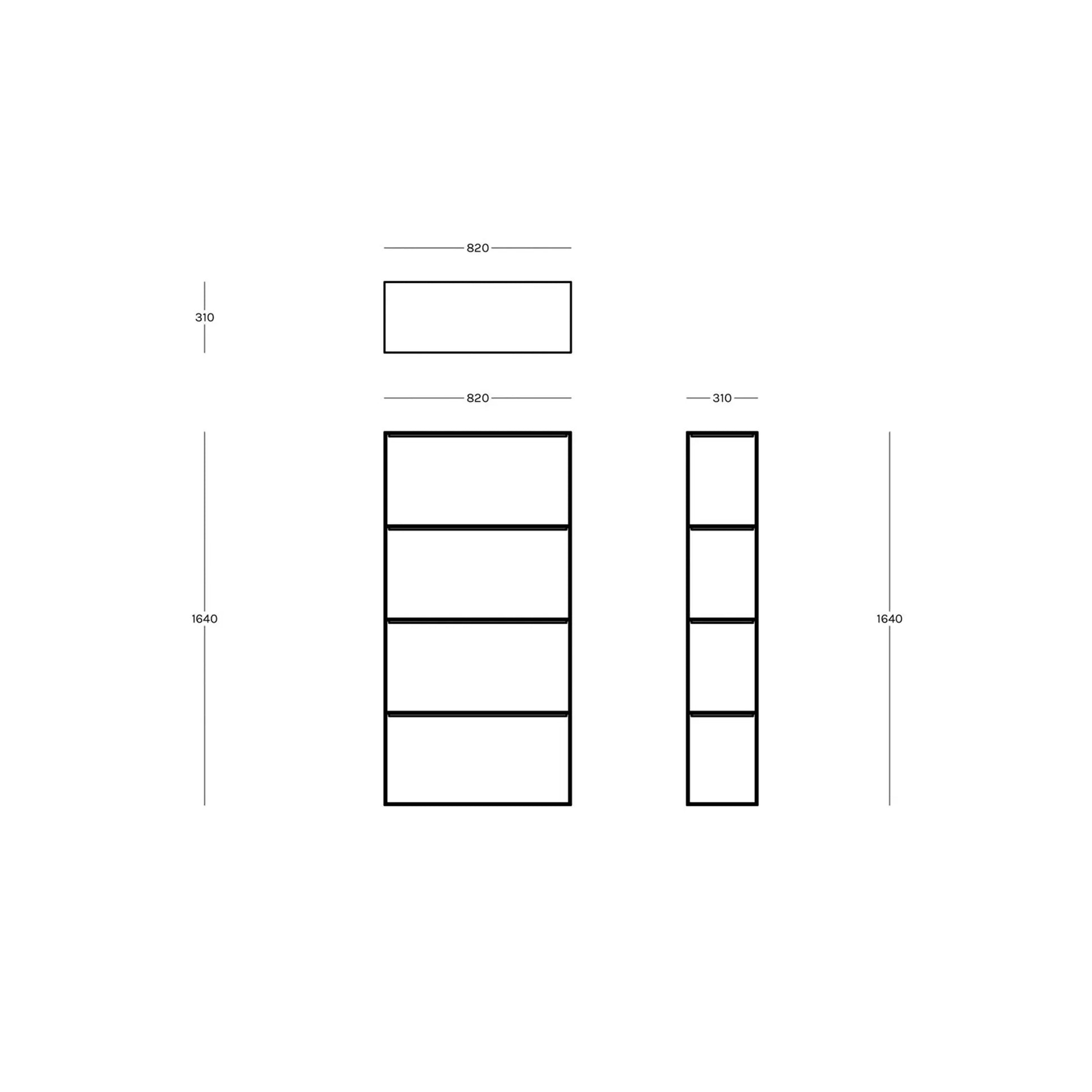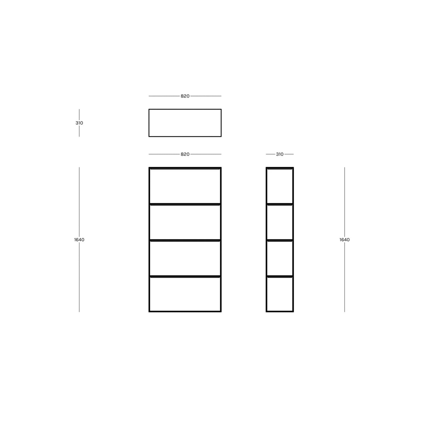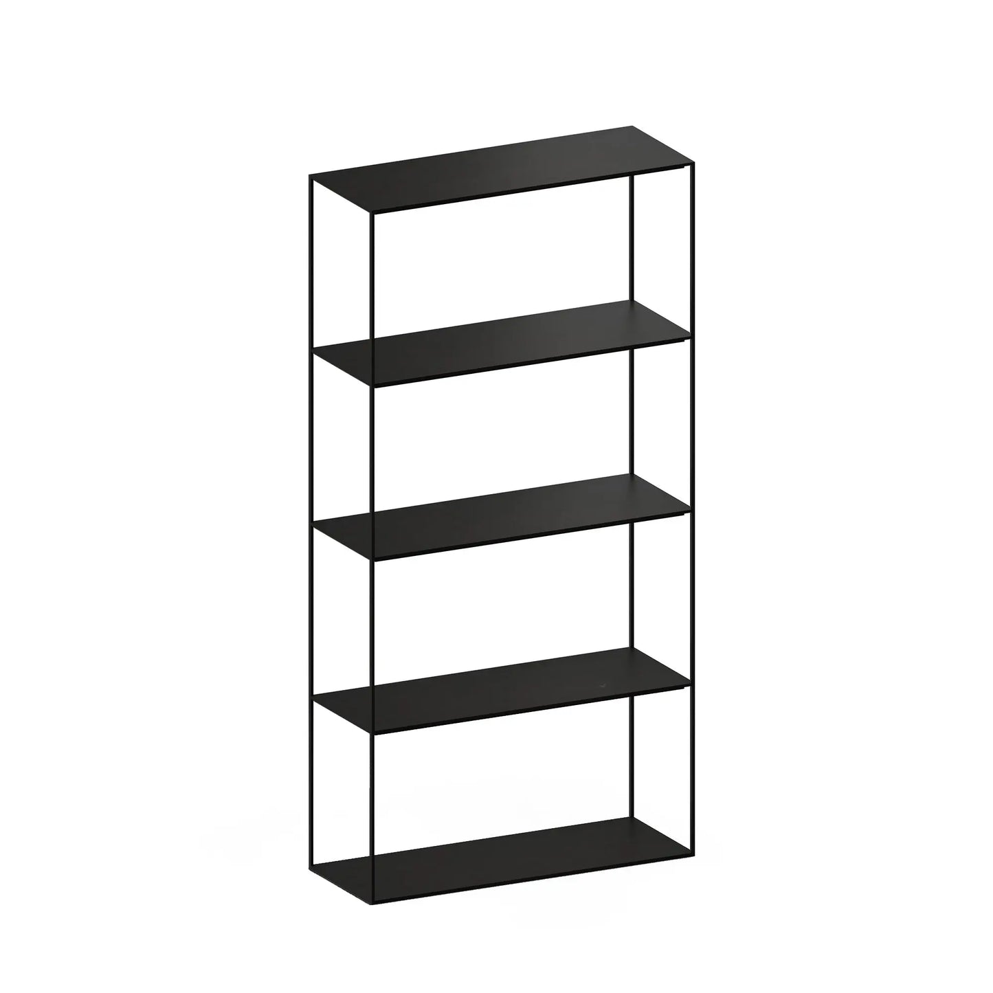 Rack with 5 shelves. Frame in solid drawn tube 8 x 8 mm and 2 mm sheet steel shelves, epoxy painted copper black sand-touch or embossed white. Usable space between shelves is 39 cm.