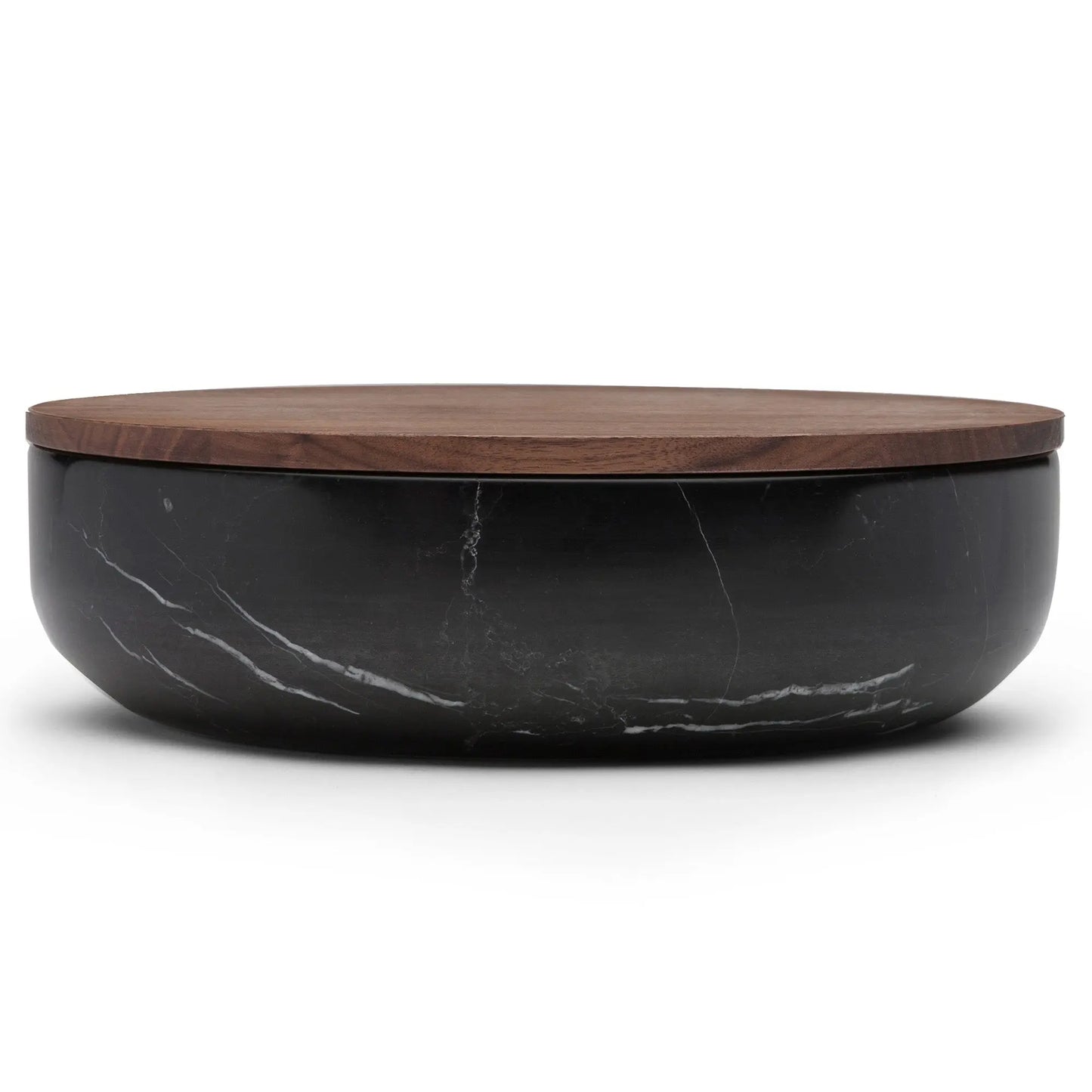 Each piece was initially composed of two elements: an earthenware container and a wooden plate. While the angle of the curve and the smooth profile of each pot are fixed, the diameter and height of the vessels vary, these shifts in scale determining whether the container framed is a bowl or a platter. The thickness of the wooden plate, which serves as both cover and plinth, is also variable.
